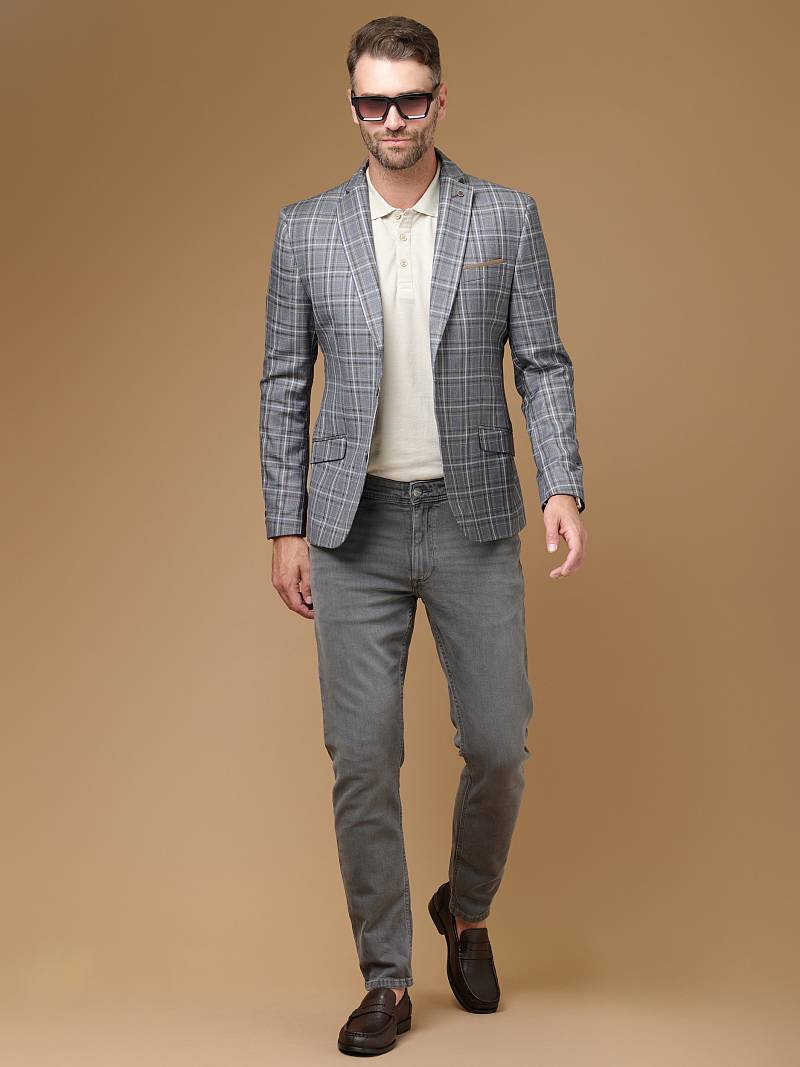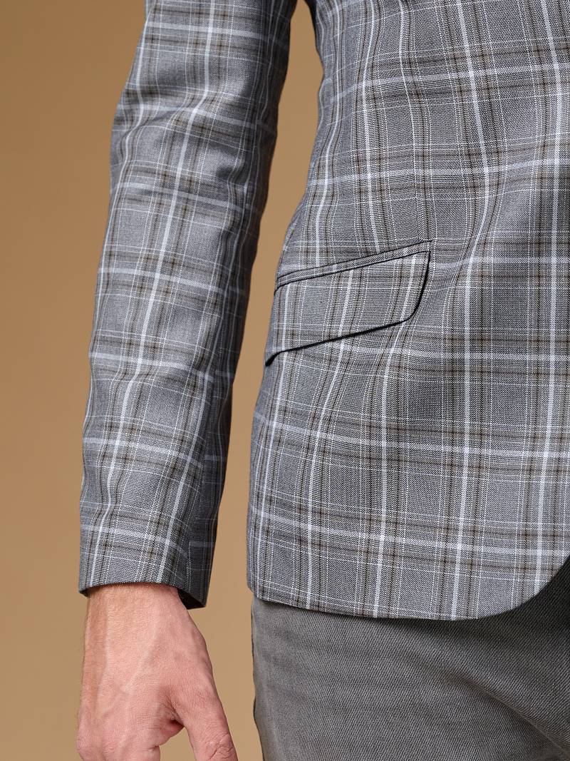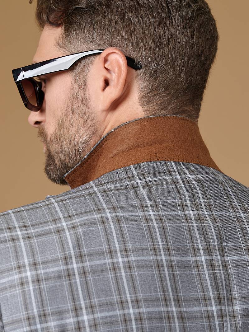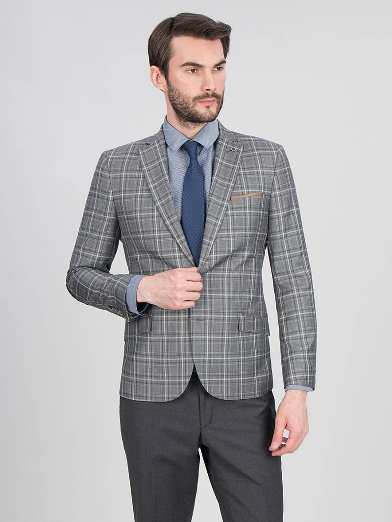 Slim fit, Классический пиджак на две пуговицы, одна шлица, рукава с налокотниками из отделочной ткани. Контрастные петли, декоративная пуговица на лацкане, нагрудный платок.