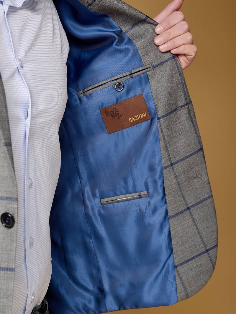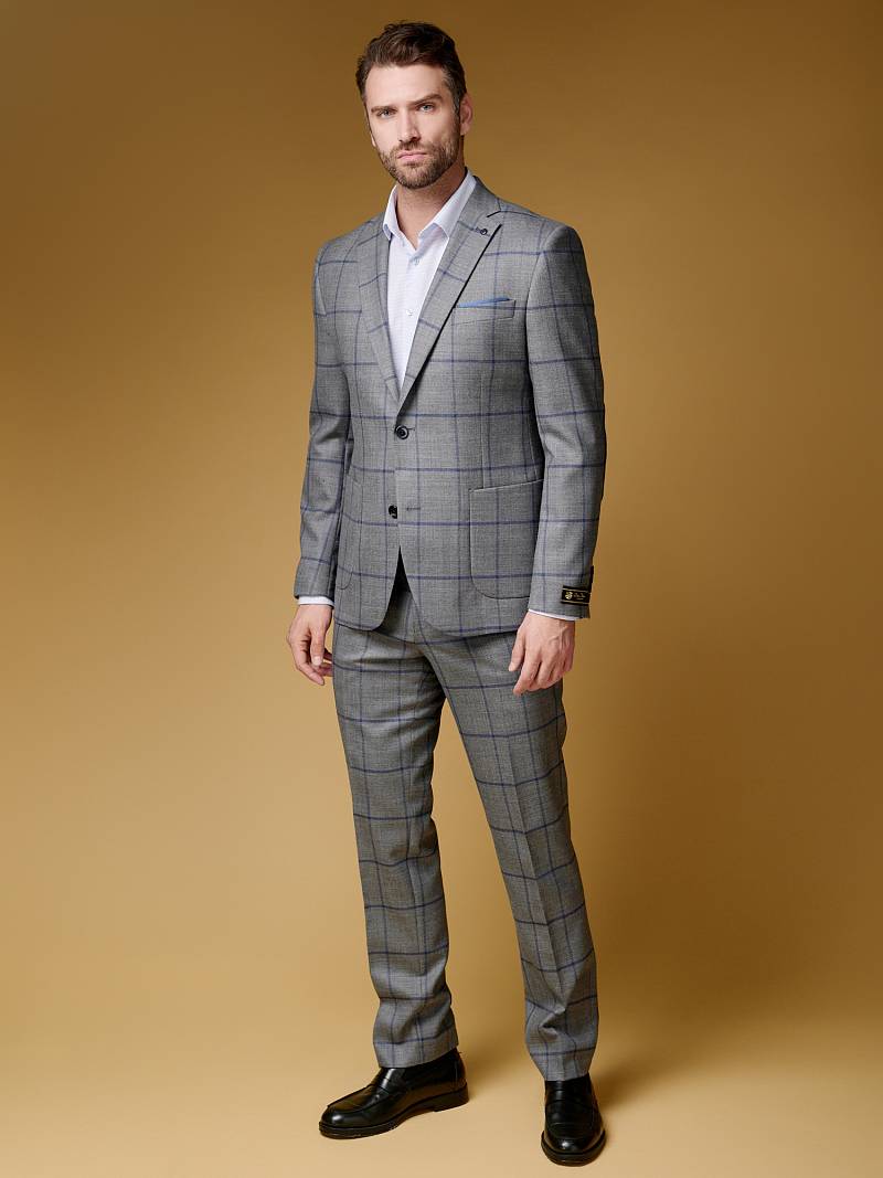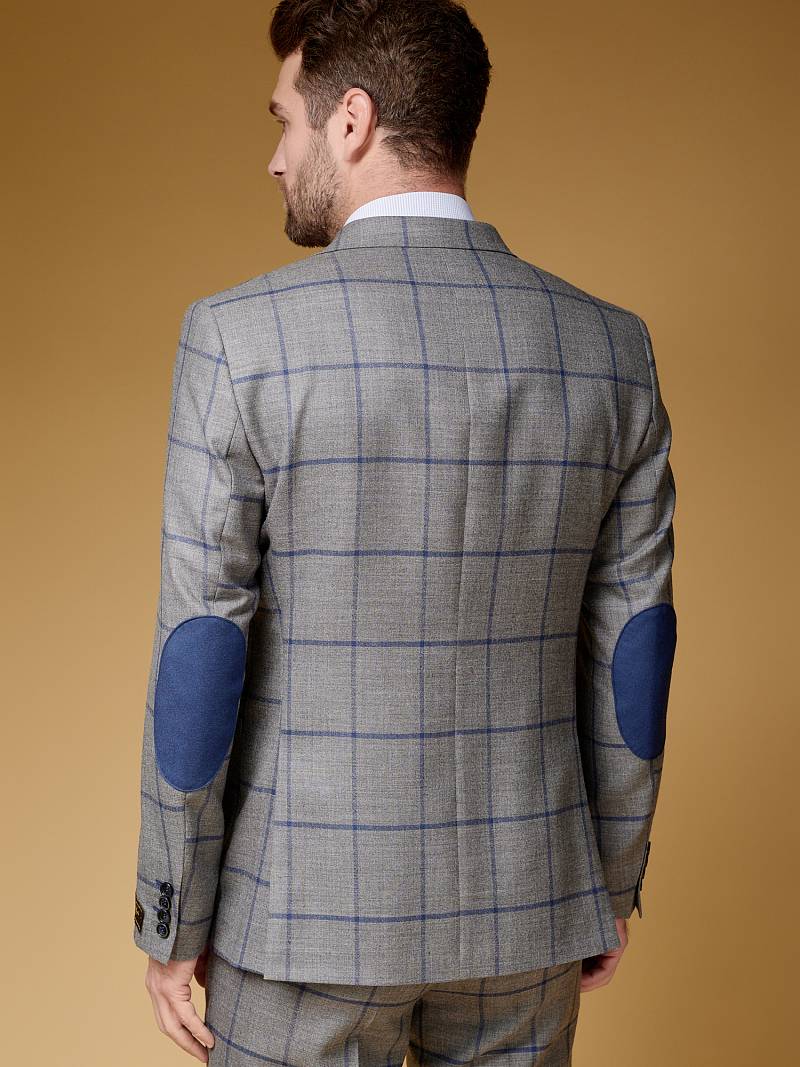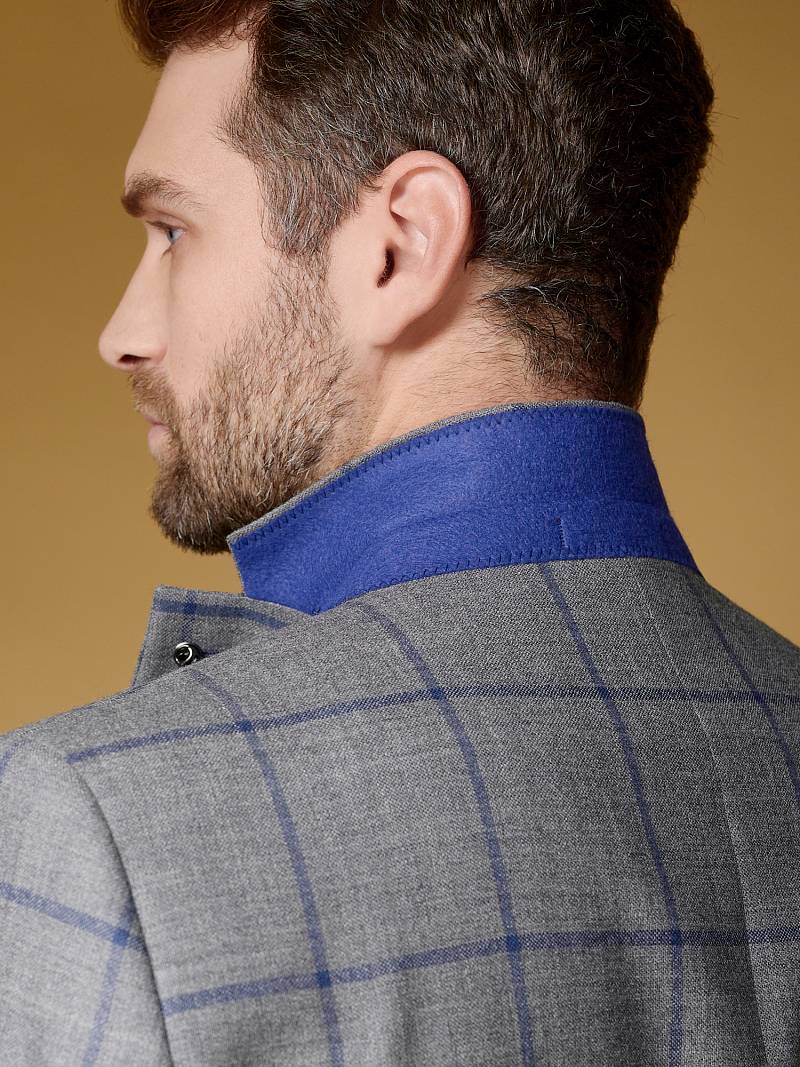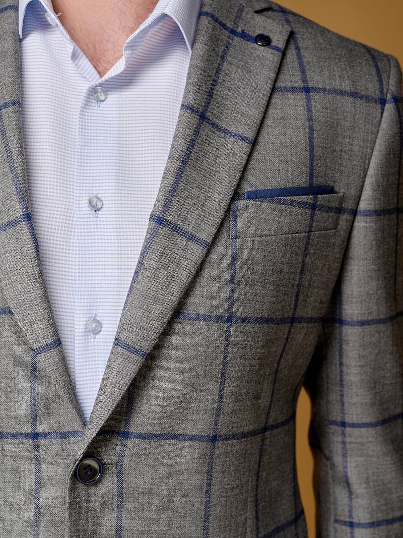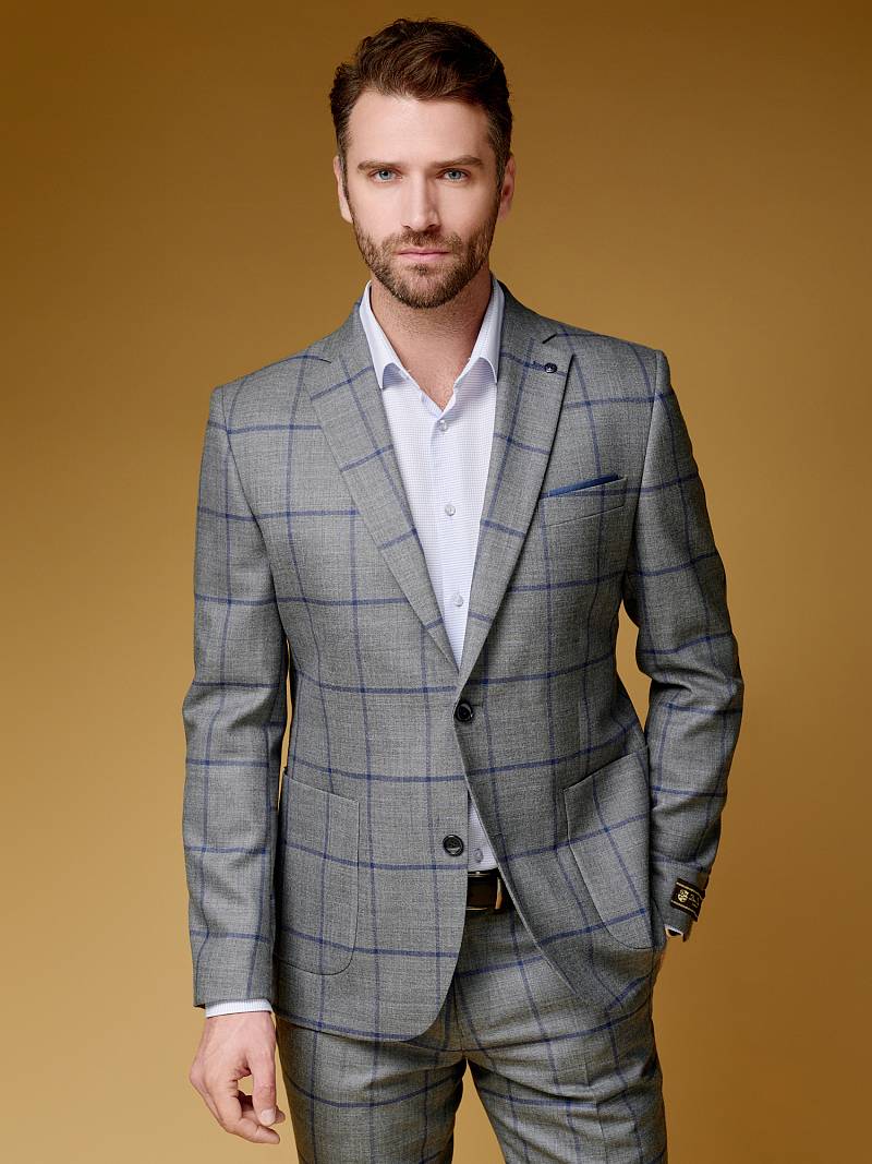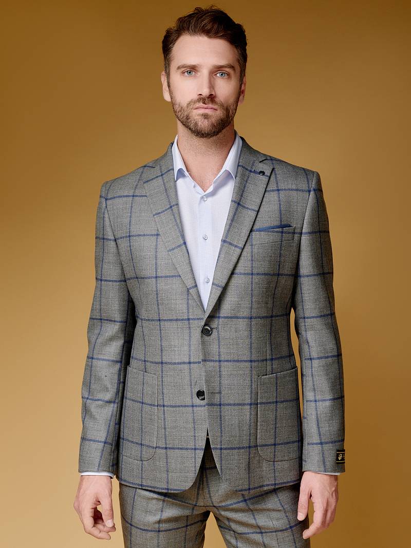 Slim fit (ПРИЛЕГАЮЩИЙ СИЛУЭТ), рекомендуется брать на размер больше. Пиджак однобортный на две пуговицы, с двумя боковыми накладными карманами и нагрудной листочкой. Рукава втачные, двухшовные со шлицей и четырьмя декоративными пуговицами. По спинке расположены две шлицы. Пиджак на подкладке, с двумя внутренними карманами.