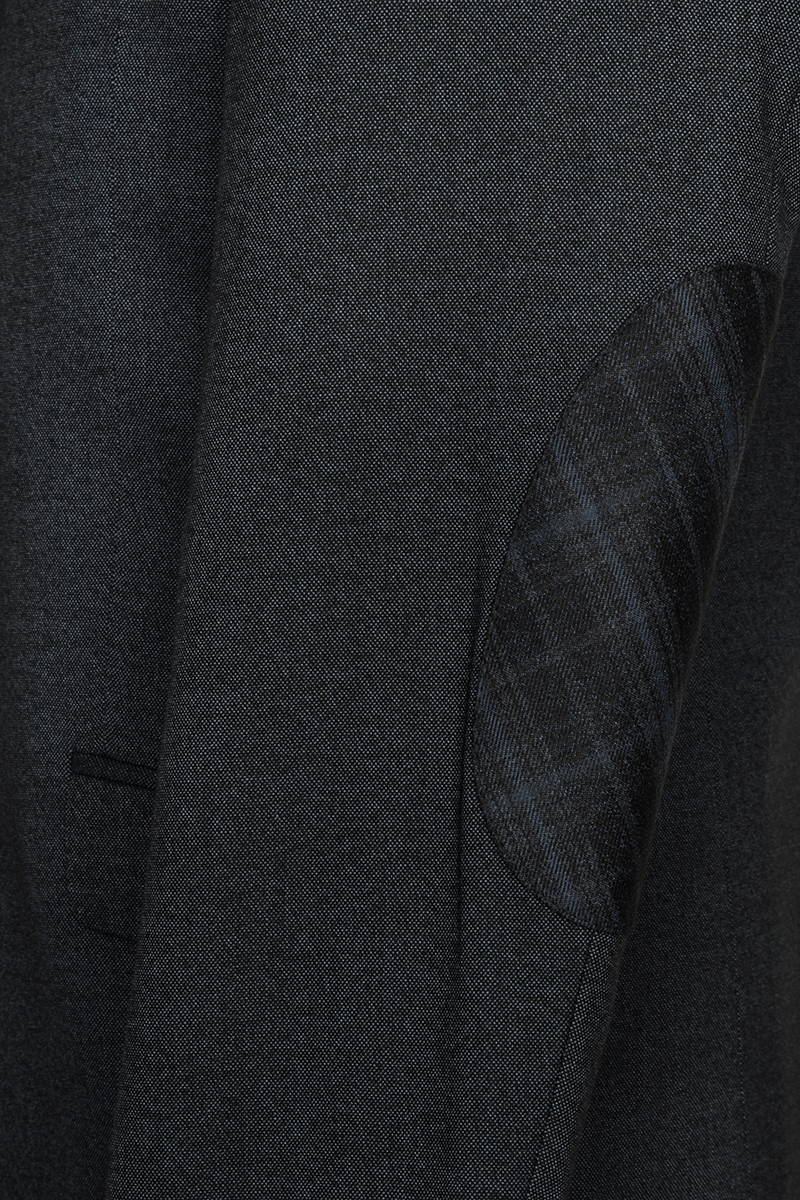 Classic fit, две пуговицы, одна шлица. Налокотники. Контрастная фасонная петля на лацкане с пуговицей.