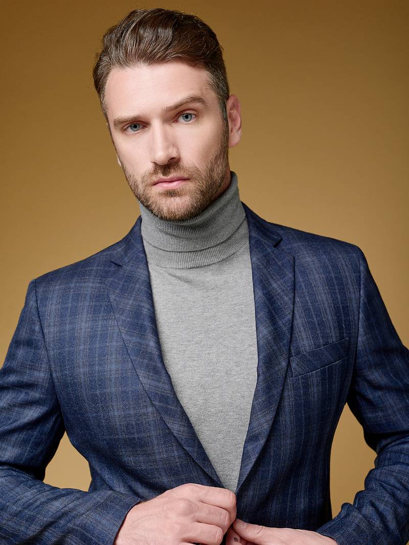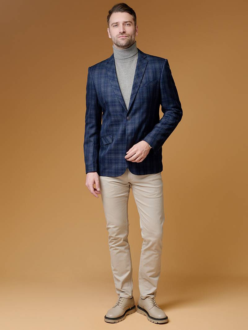 Classic fit, две пуговицы, одна шлица. Лацкана, нагрудная листочка и клапаны карманов по косой.