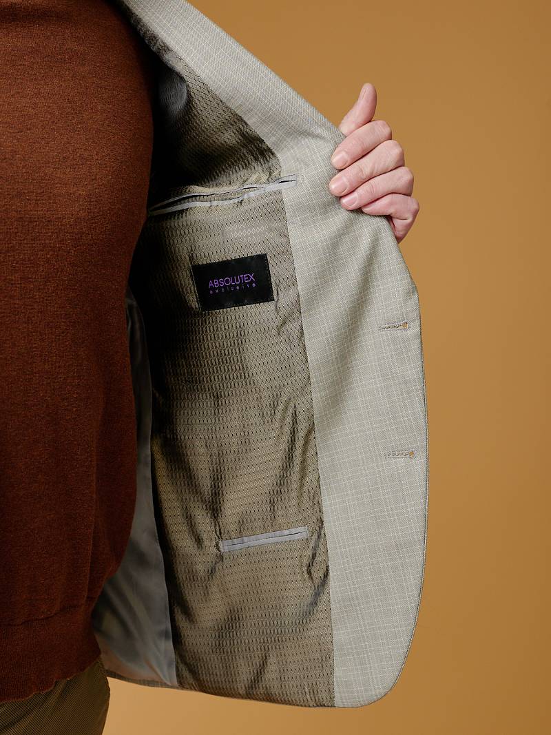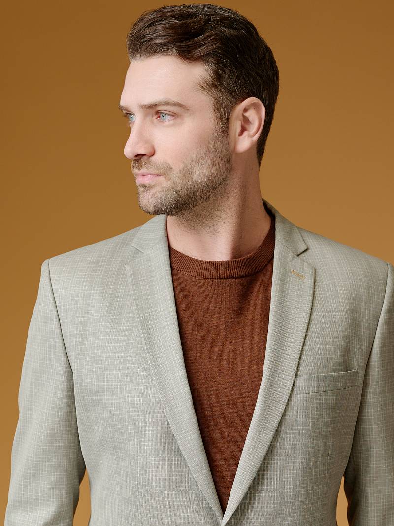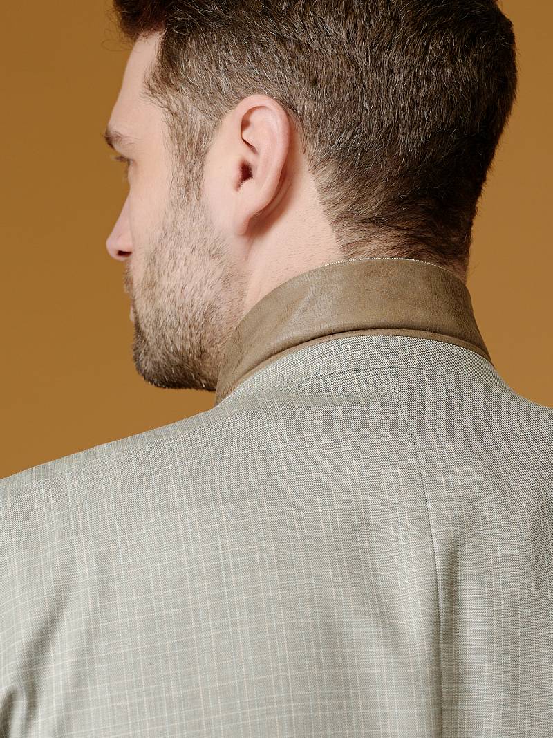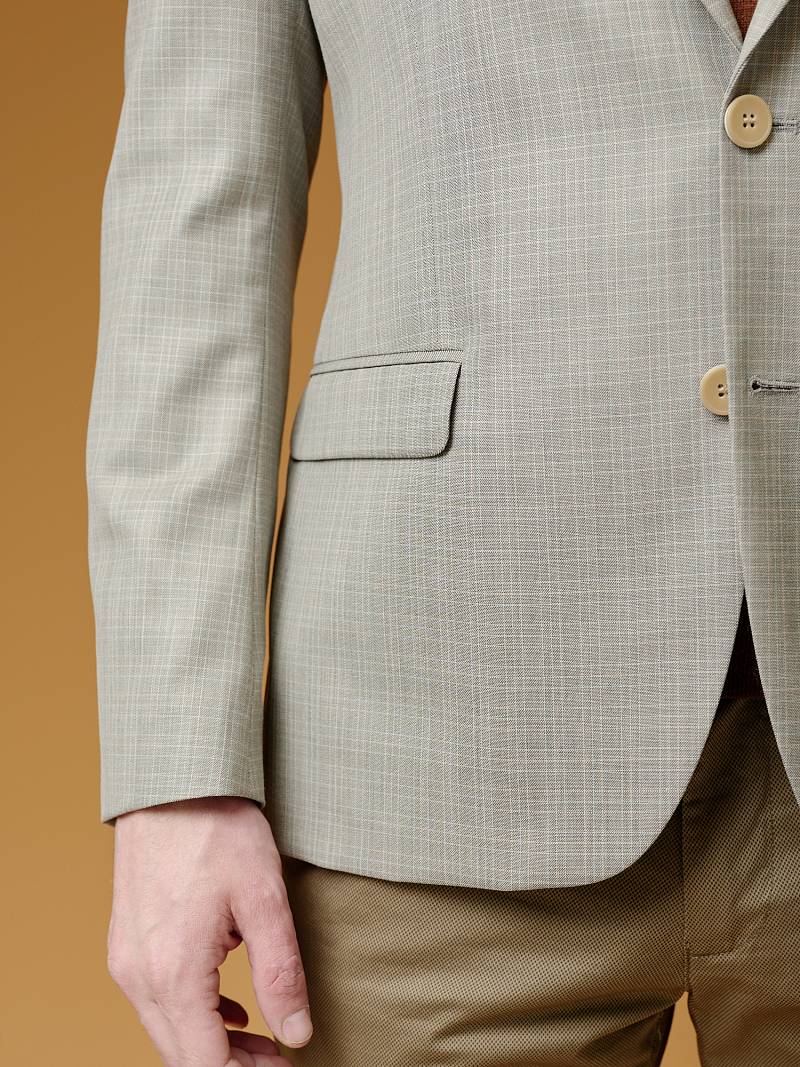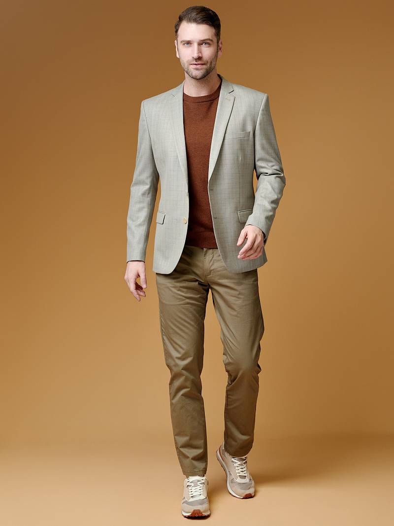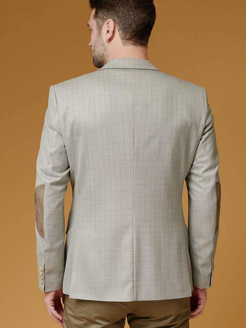Slim fit две пуговицы, две шлицы, налокотник, нижний воротник из отделочной ткани, декоративные петли на шлицах рукавов.
