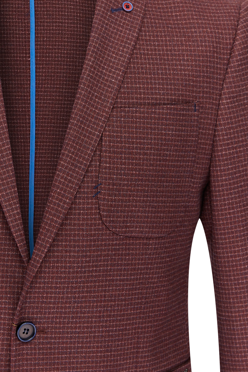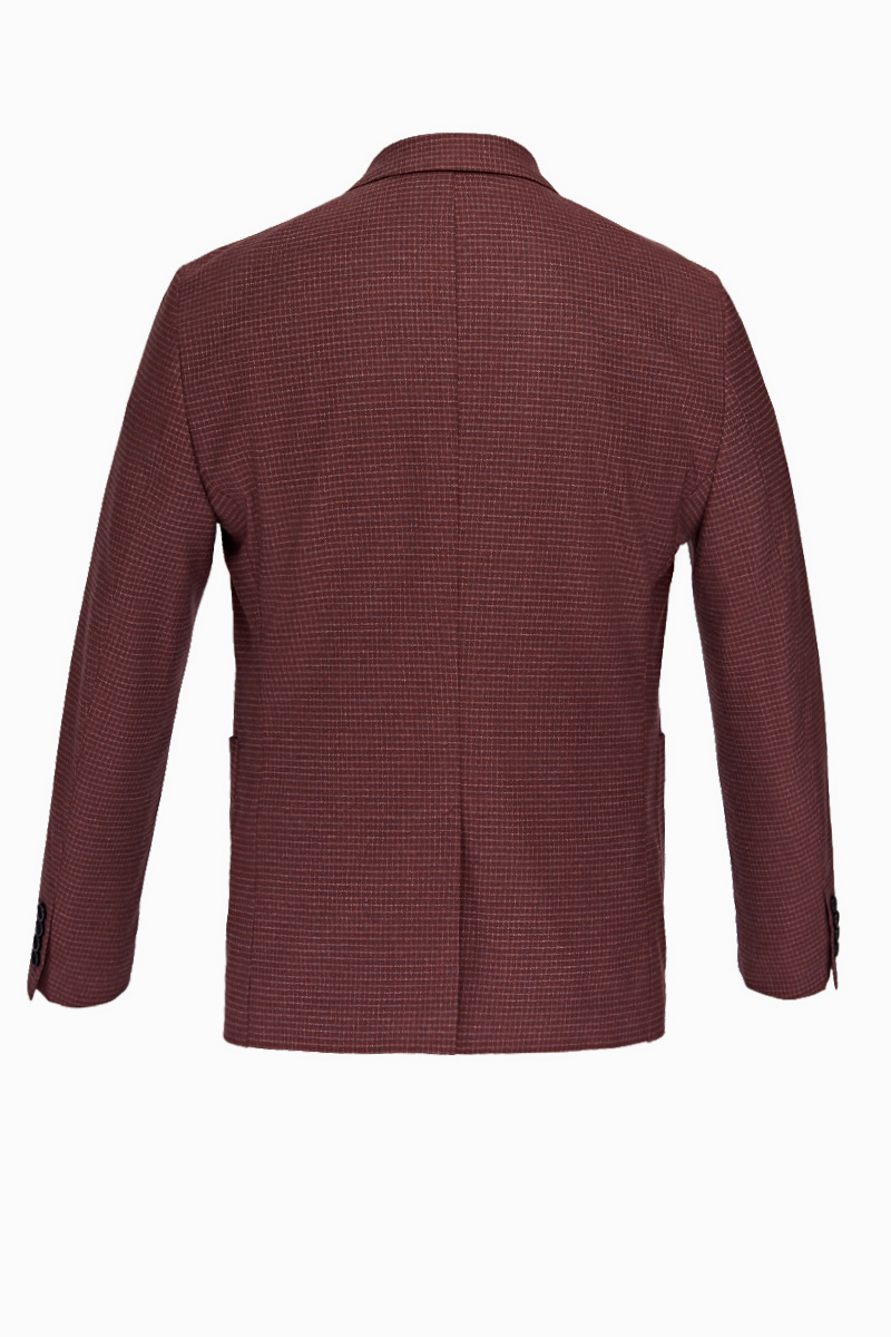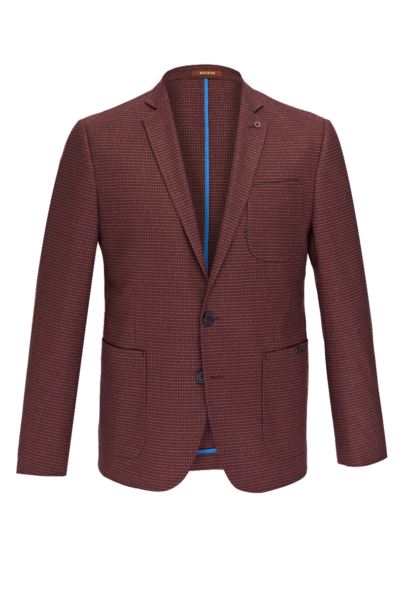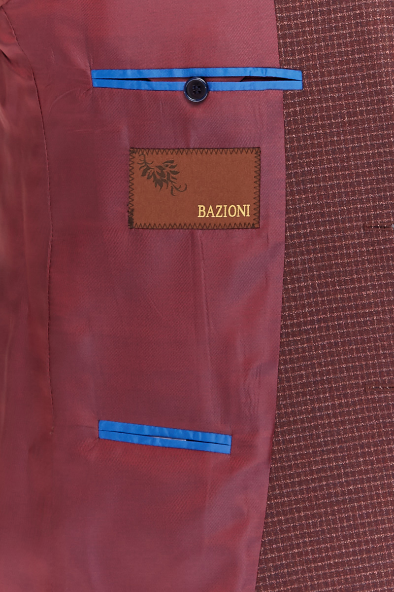 Slim fit, две пуговицы, одна шлица, спинка без подкладки, накладные карманы. Фирменная нашивка на нижнем кармане. Закрепки отделочные - в углах накладных карманов. BAZIONI