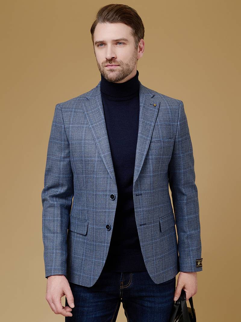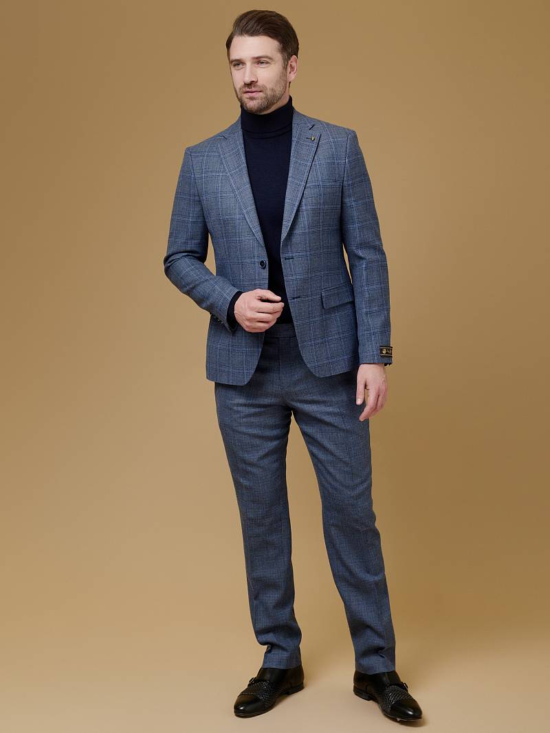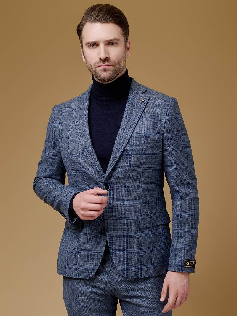 Slim fit (ПРИЛЕГАЮЩИЙ СИЛУЭТ), рекомендуется брать на размер больше. Пиджак однобортный на две пуговицы, с двумя боковыми карманами и нагрудной листочкой. Рукава втачные, двухшовные со шлицей и четырьмя декоративными пуговицами. По спинке расположены две шлицы. Пиджак на подкладке, с двумя внутренними карманами.