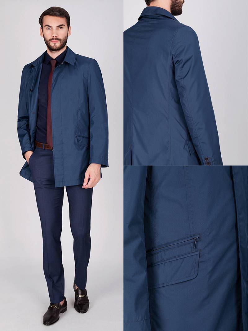 Плащ мужской не утепленный на подкладке. Slim fit. Центральная супатная застежка на 3 пуговицы+1 верхняя пуговица насквозь. Воротник отложной с стойкой, на стойке крючок. Боковые карманы прорезные с клапаном+ на правой полочке карман на молнии. Спинка со средним швом и шлицей. Рукав втачной двухшовный. В нижней части рукава,по локтевому шву, по три декоративные пуговицы. Два внутренних кармана на молнии. Ткань верха: 100% полиэстер. Подкладка: 100% полиэстер. Утеплитель: без утеплителя. Длина по спинке для роста 176 - 82см.