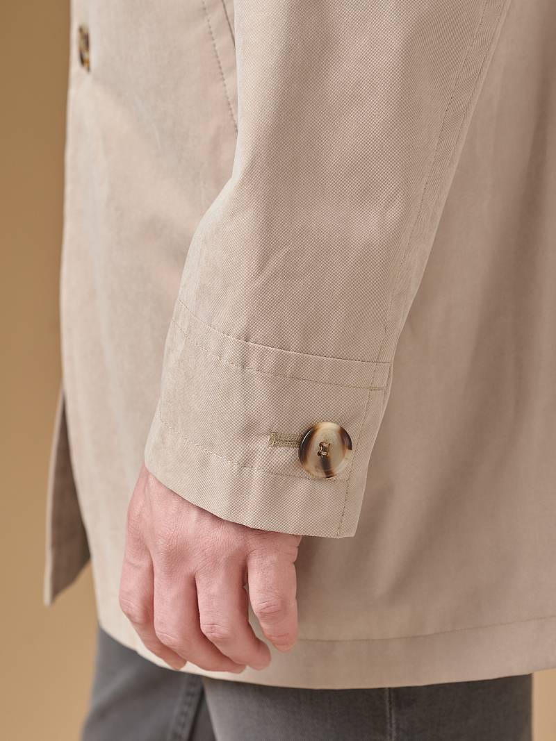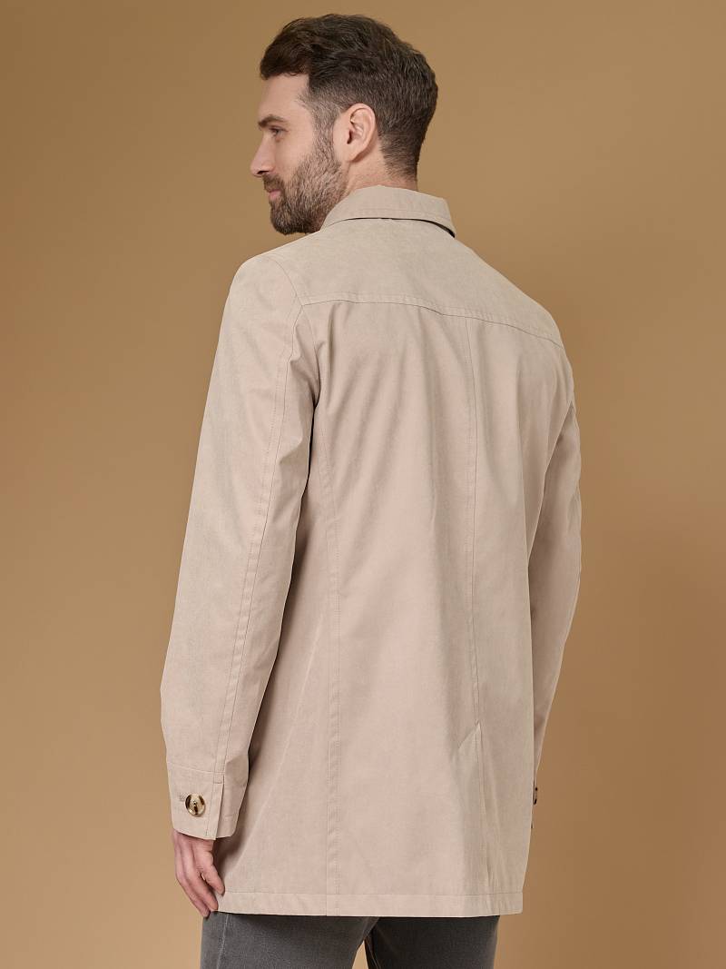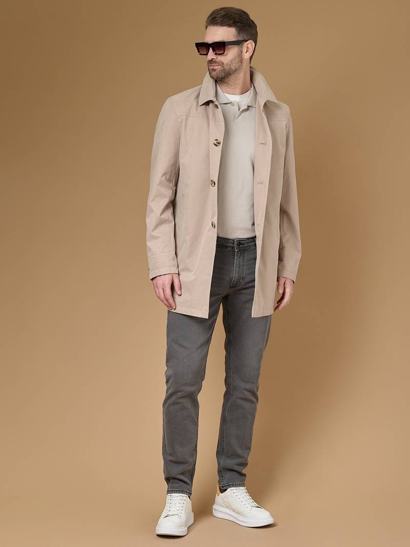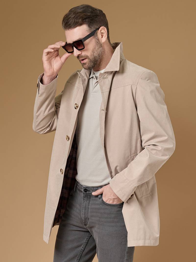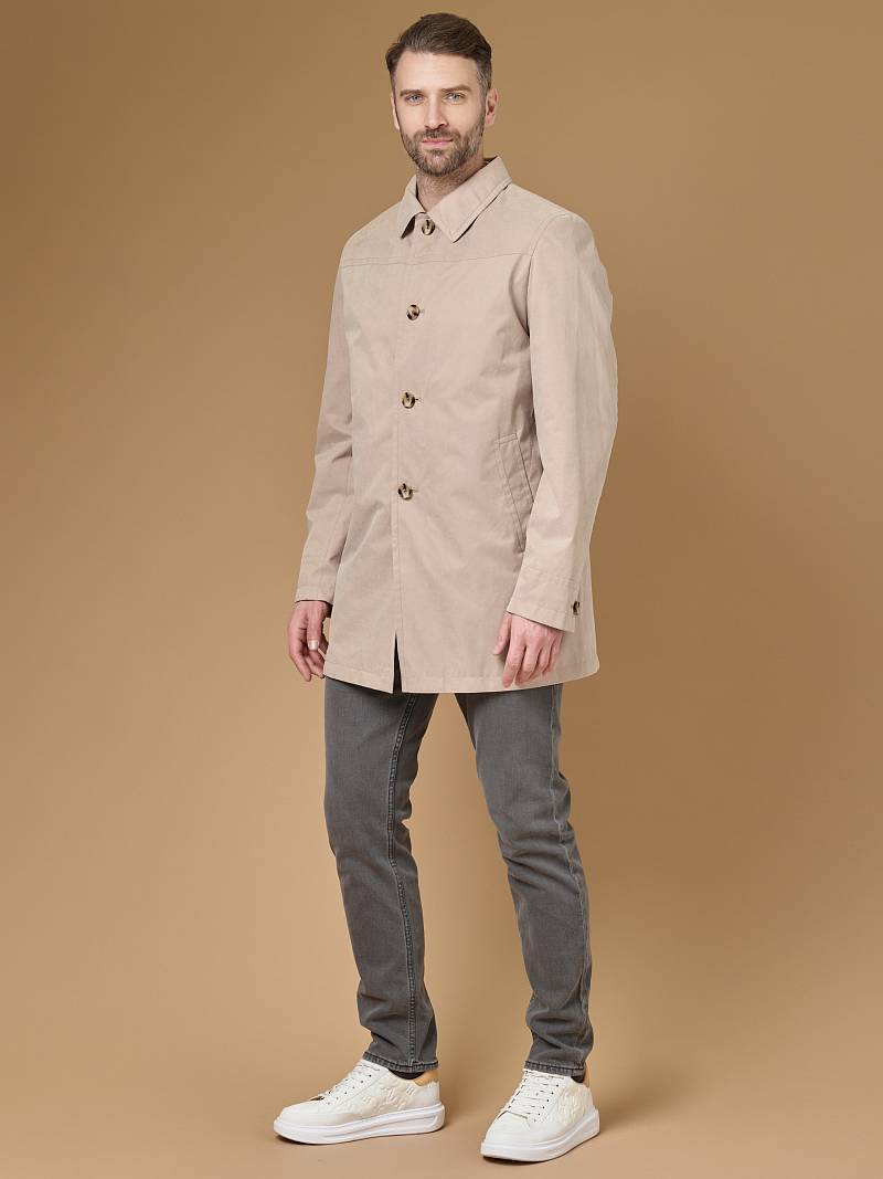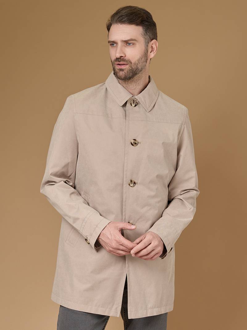 Плащ мужской классический полуприлегающего силуэта, 4 пуговицы и 1 шлица. Длина изделия по спинке для роста 176 - 85см. Ткань верха: 55% нейлон, 45% хлопок. Подкладка: 100% полиэстер. Без утеплителя