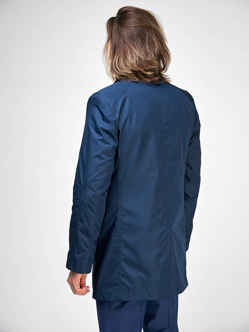 Плащ мужской, центральная застёжка на молнию, воротник -стойка, боковые карманы -прорезные с втачными листочками, полочка и спинка с отрезными кокетками, спинка со средним швом и шлицей на двух потайных кнопках, на левом кармане-нашивка с логотипом, на подкладке два внутренних кармана на молниях. Длина изделия по спинке для размера роста 50/176-85см. Ткань верха: 100% полиэстер. Подкладка: 100% полиэстер. Без утеплителя.