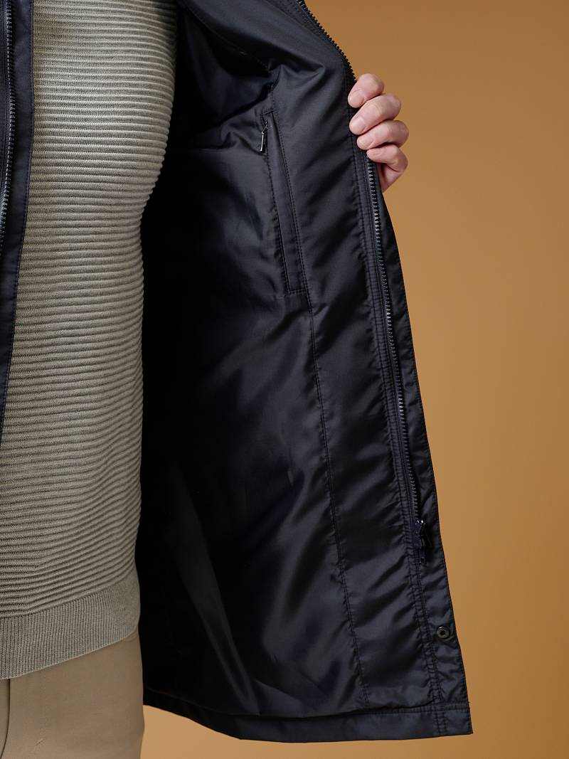 Плащ мужской, центральная застёжка на молнию, воротник -стойка, боковые карманы -прорезные с втачными листочками, полочка и спинка с отрезными кокетками, спинка со средним швом и шлицей на двух потайных кнопках, на левом кармане-нашивка с логотипом, на подкладке два внутренних кармана на молниях. Длина изделия по спинке для размера роста 50/176-85см. Ткань верха: 100% полиэстер. Подкладка: 100% полиэстер. Без утеплителя.