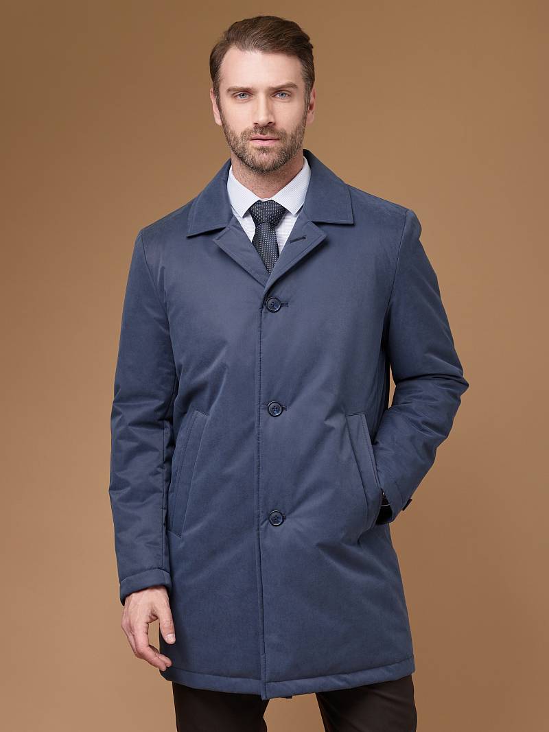 Плащ мужской утепленный классический полуприлегающего силуэта из ткани с водоотталкивающей пропиткой, которая защищает от ветра и влаги. Застёжка центральная на пуговицы, воротник и лацкан классические, На полочках - два боковых прорезных кармана с листочкой. Спинка с отрезной кокеткой, средним швом и шлицей. Рукав втачной, двухшовный. На подкладке два внутренних кармана на пуговицах. Отлично подходит