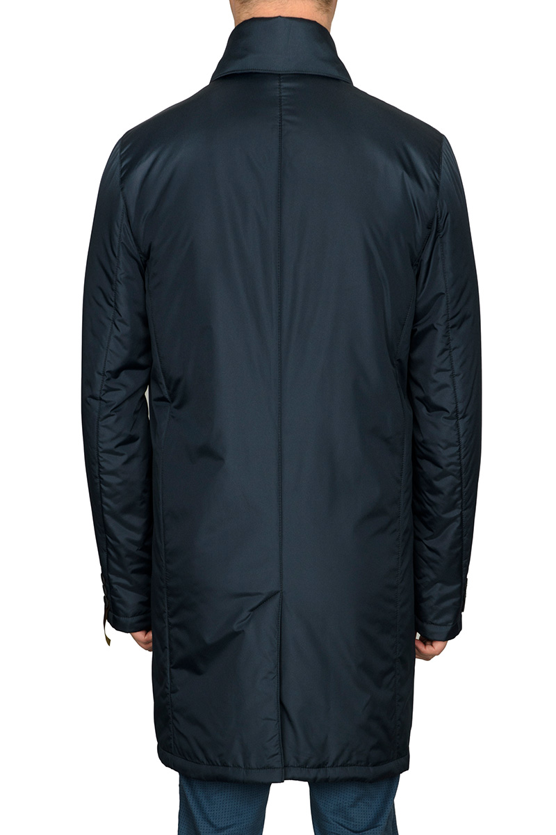 Плащ мужской утепленный прямого силуэта. Застёжка - супатная на пуговицах и внизу на потайную кнопку. Воротник отложной. По спинке - 1 шлица. Карманы на полочках - прорезные с листочками, застегивающиеся на магниты. На подкладке полочек - два внутренних прорезных кармана в рамку.