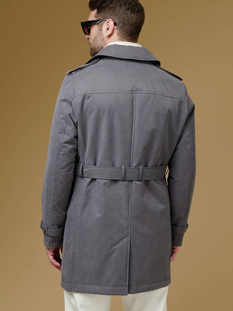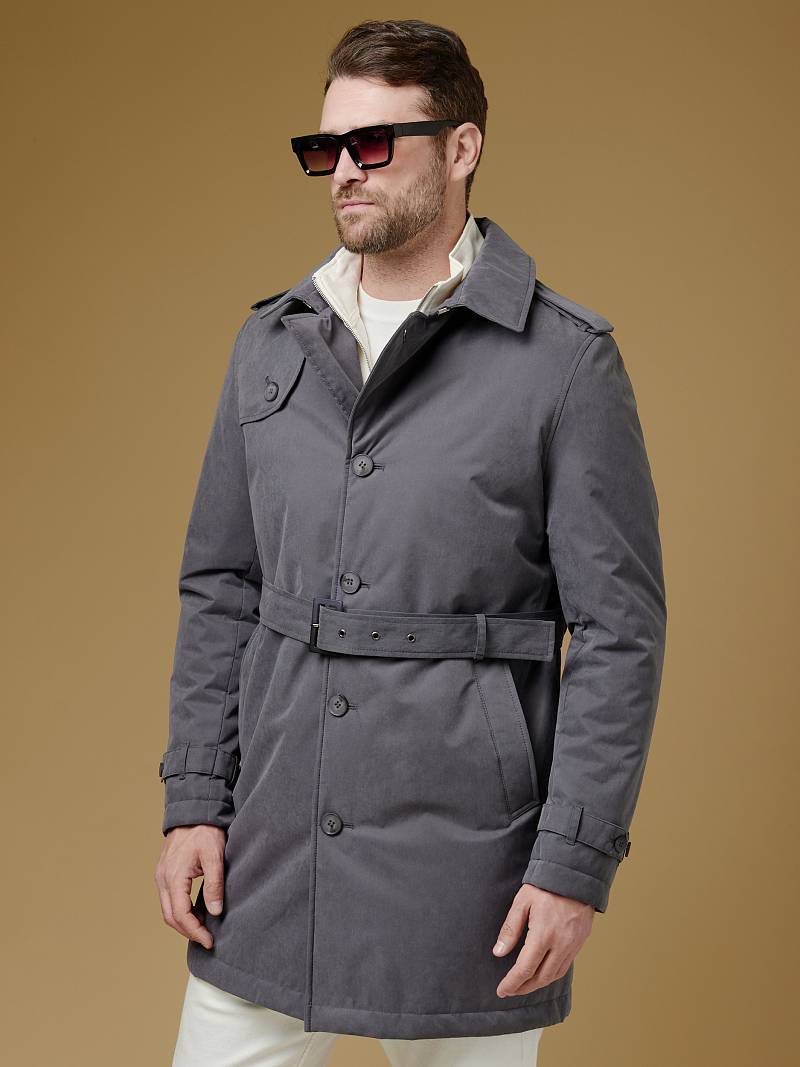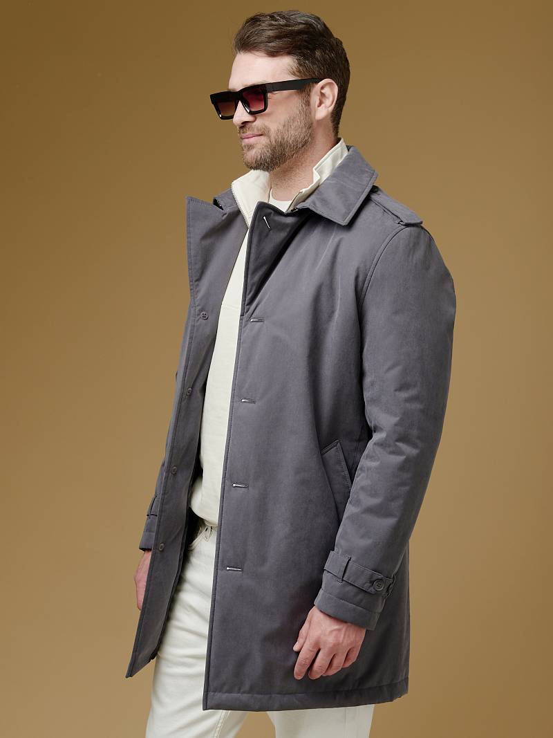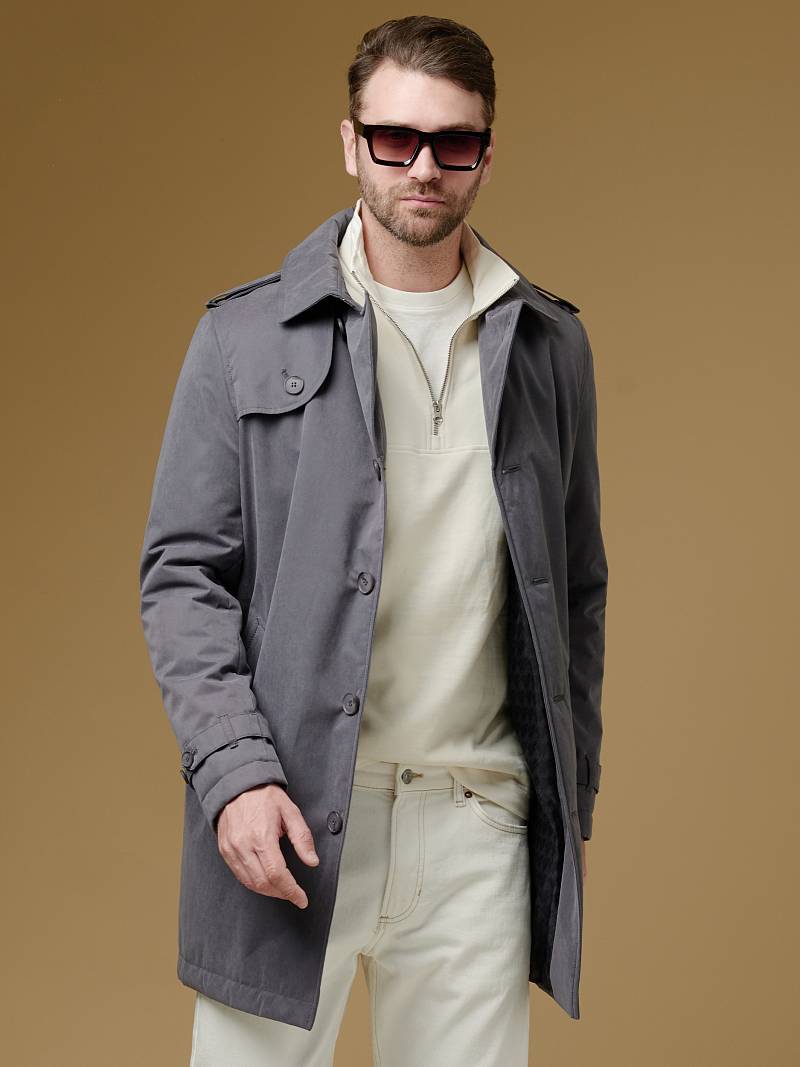 Плащ- тренч мужской утепленный однобортный с лацканами, с застежкой доверху на пуговицы, Изделие из курточной ткани с мембраной TPU. Современная одежда из материалов с TPU покрытием отличается отличной дышащей способностью, что в сочетании с водонепроницаемостью и защитой от ветра обеспечивает комфорт пользователю. Правая полочка с отлетной кокеткой. На полочках - боковые наклонные карманы с листочкой на скрытых магнитах. Спинка с притачной кокеткой и шлицей в среднем шве. Рукав втачной двухшовный, в нижней части рукава в шлевках закреплена пата, регулируемая двумя пуговицами. Воротник - высокий отложной со стойкой и крючком необходим для защиты от ветра и будет шиком - его немного приподнять. Погоны на пуговицах - самая классическая деталь тренча. Плащ по талии регулируется ремнем с пряжкой, пряжка позволяет быстро затянуть пояс в непогоду. На подкладке два внутренних кармана на пуговицах. Длина спинки для роста 176 - 91см. Ткань верха: 55% нейлон, 45% хлопок. Подкладка: 100%полиэстер. Утеплитель: термоплюс