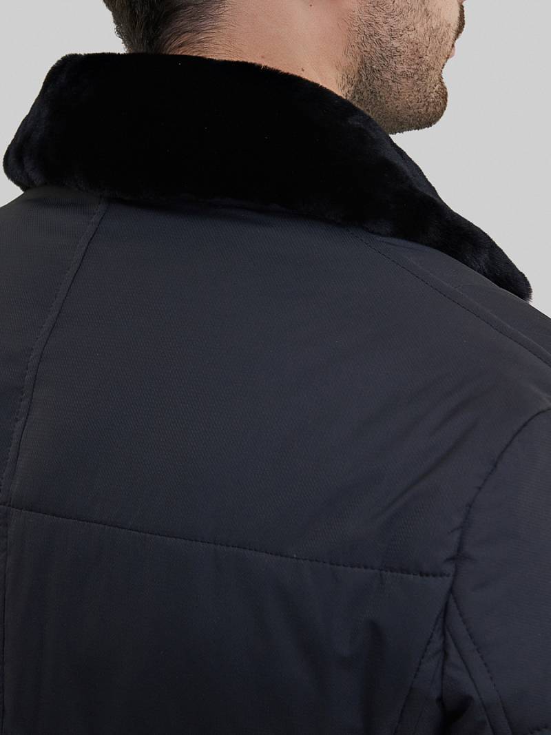 Куртка мужская утепленная с воротником из натурального меха мутон. Застежка изделия центральная на молнию и ветрозащитную планку на 4 пуговицы. Воротник - отложной на стойке. Спинка, полочка и передние части рукавов простеганы стежкой. На полочке боковые карманы прорезные с фигурными клапанами на пуговицах и дополнительно вертикальные карманы "в шве" на магнитах. Спинка со средним швом и шлицей. На левом рукаве - герб-нашивка, по низу рукавов - иммитация шлицы на пуговицах. обтачки боковых карманов - из отделочной ткани. На подкладке - два внутренних прорезных кармана на пуговицах. Длина изделия по спинке для роста 176 - 95см. Ткань верха: 100% полиэстер. Подкладка: 100% полиэстер. Утеплитель: Био-пух 100%(180г/м2). Воротник натуральный мутон