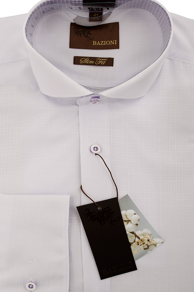 Slim fit, воротник-акула, стойка воротника - на 2 пуговицы. Манжет с универсальный под запонку, застежка - без отделки. Отделка - внутренняя стойка и внутренний манжет.