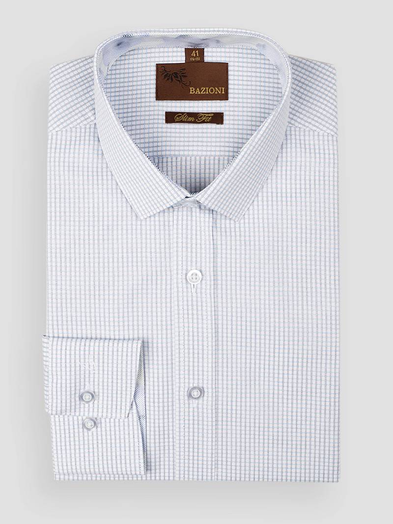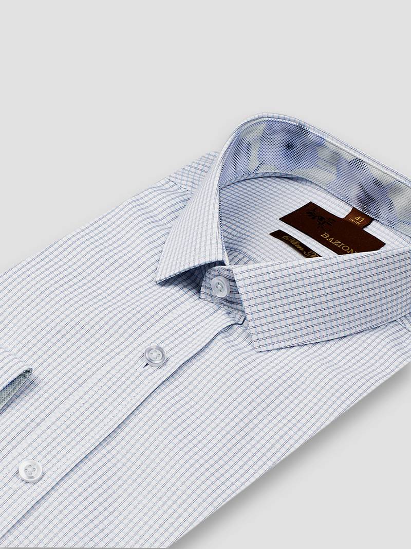 Slim fit, узкий воротник, манжет полукруглой формы на две пуговицы, застежка- ложная планка 3,0см. Внутренний манжет и внутренняя стойка - из отделочной ткани.