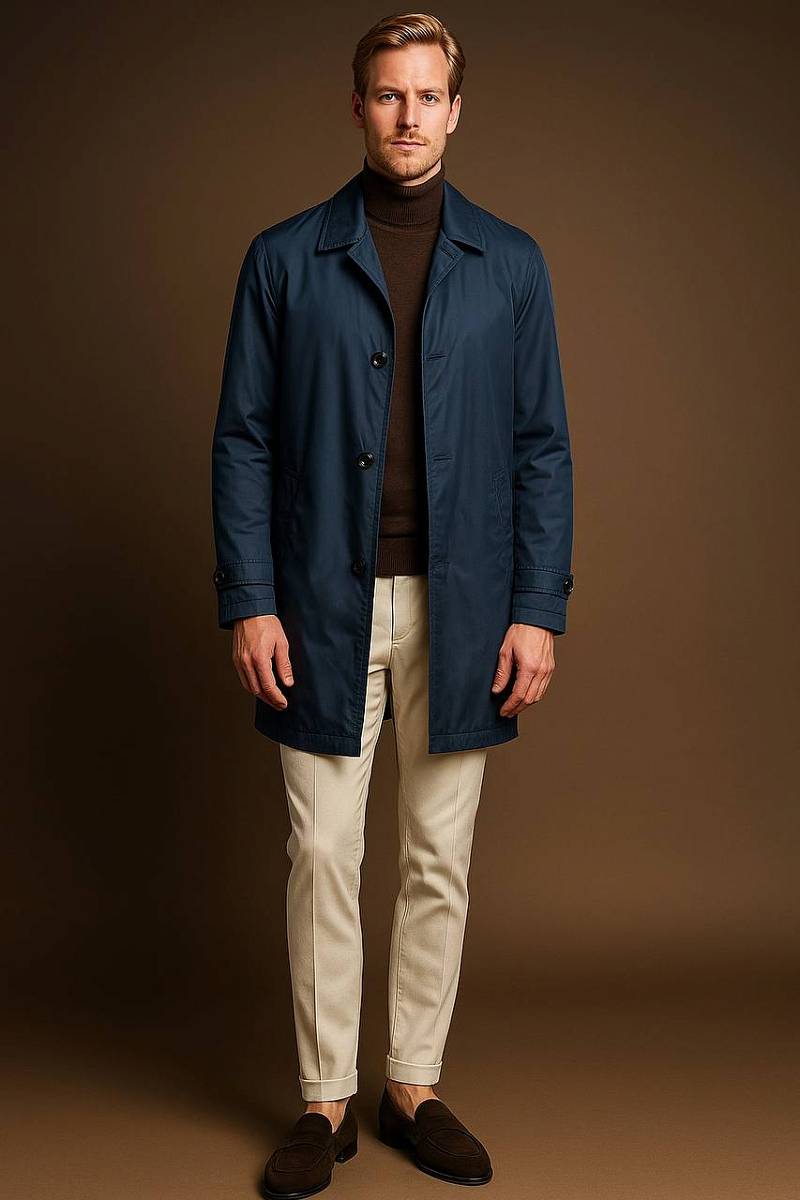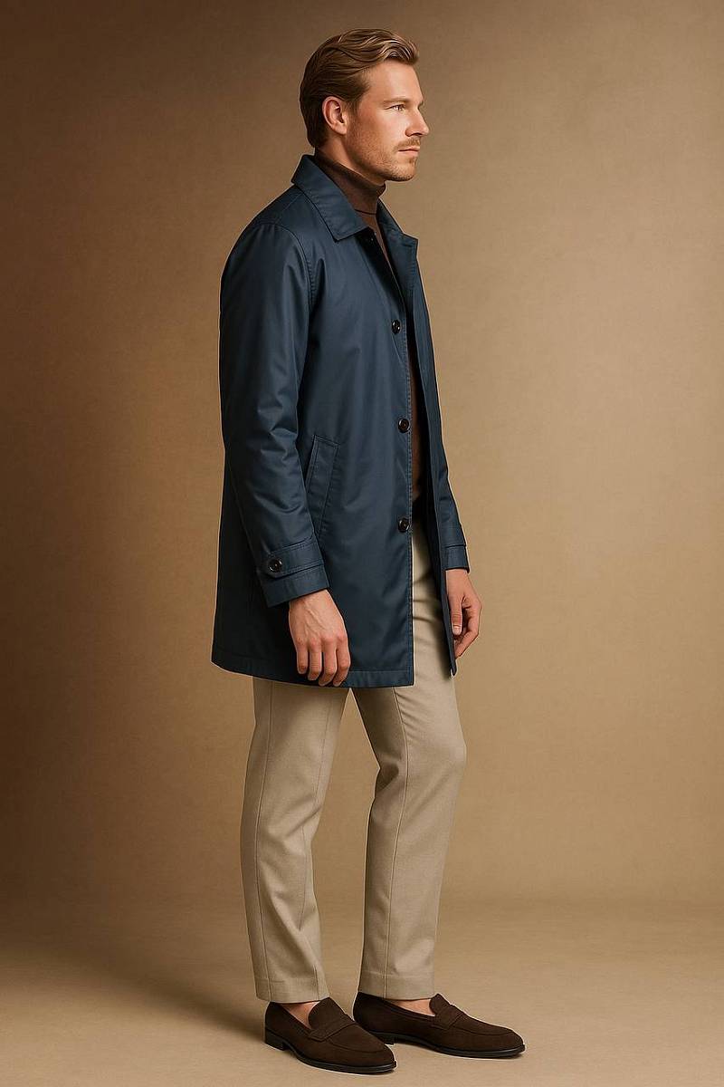 Плащ мужской весенний осенний полуприлегающего силуэта из плащевой ткани с влагоотталкивающей отделкой эффективно защитит в непогоду, что в сочетании с водонепроницаемостью и защитой от ветра обеспечивает комфорт пользователю.