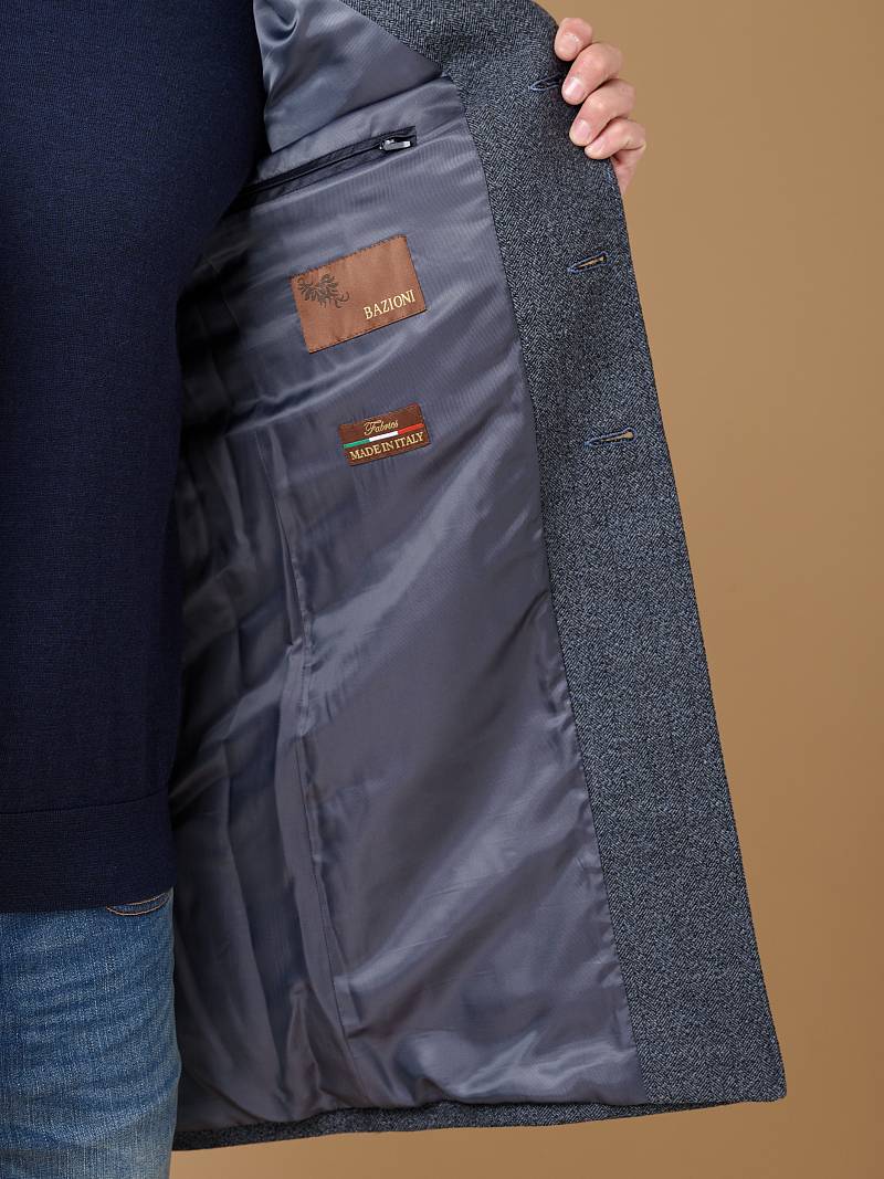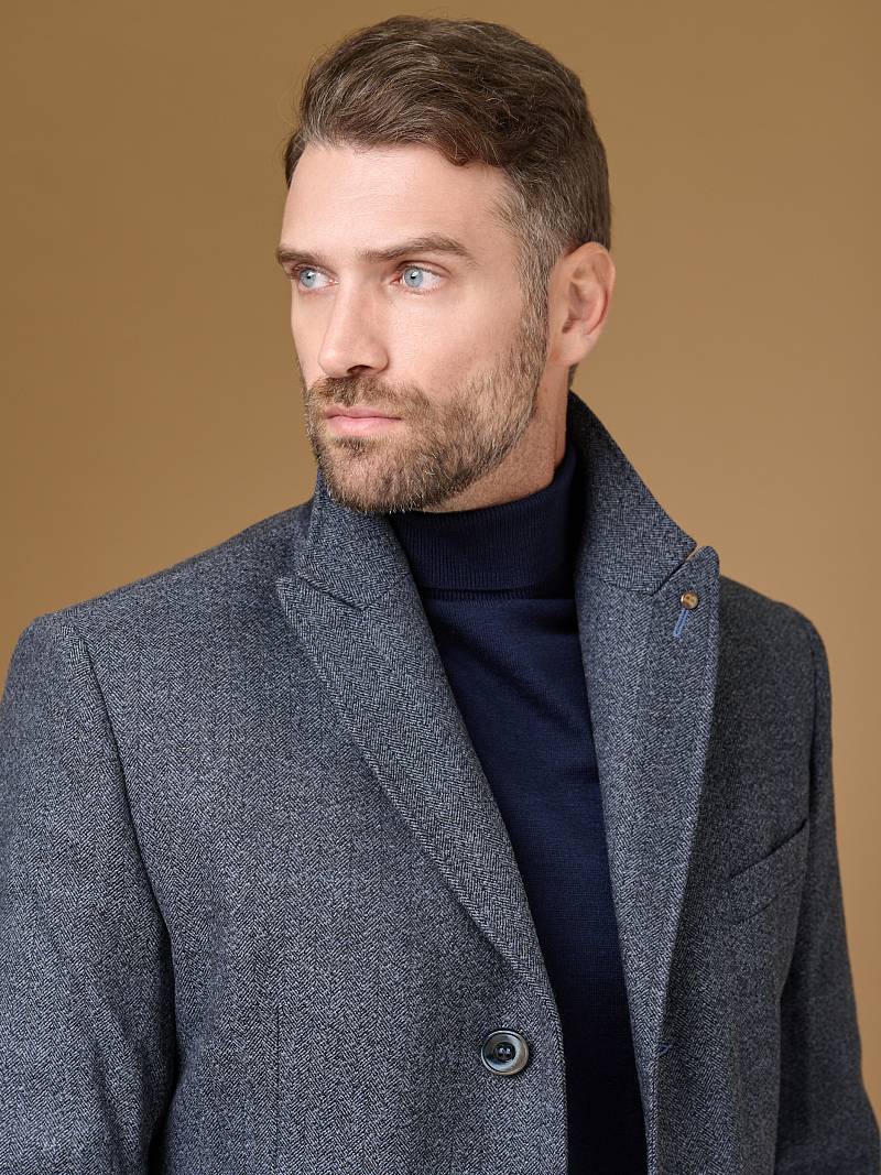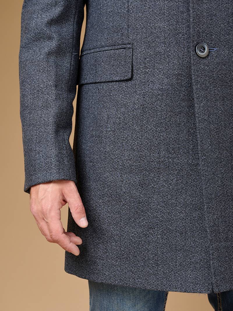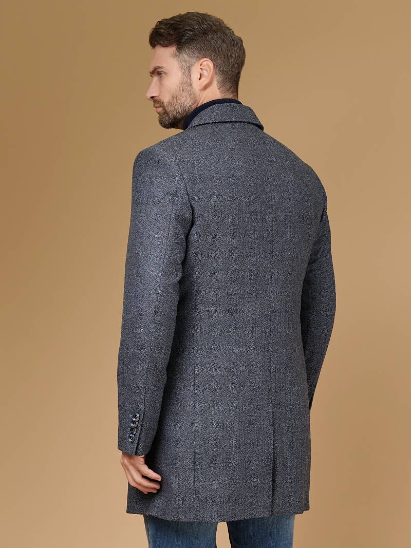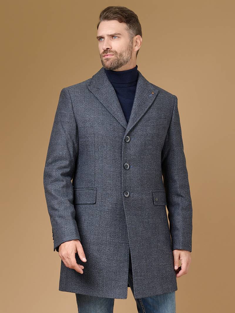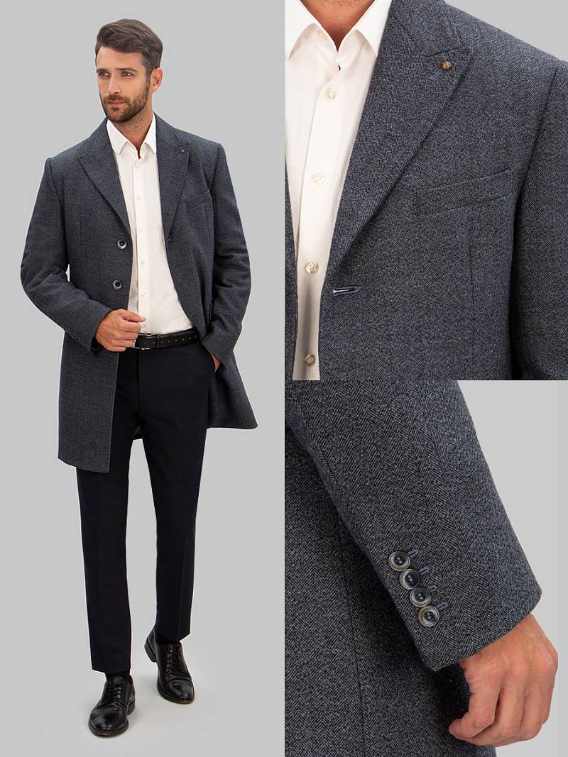 Пальто с центральной застежкой на 3 пуговицы, лацкан "ласточкин хвост", На полочках - боковые карманы с клапанами, нагрудный карман на левой полочке, Рукав втачной с локтевым швом, по низу рукавов шлица с пуговицами, Спинка со средним швом и шлицей. На подкладке два внутренних кармана на молниях. Фасонная петля на лацкане. Утеплитель 160гр.