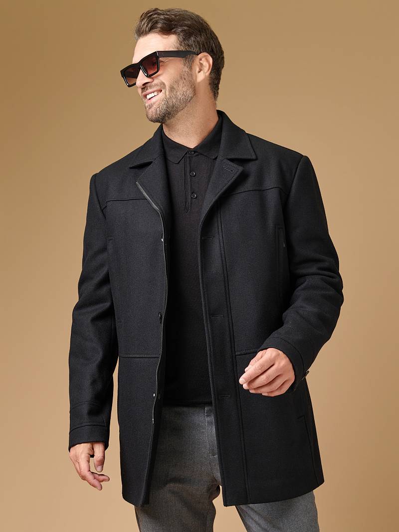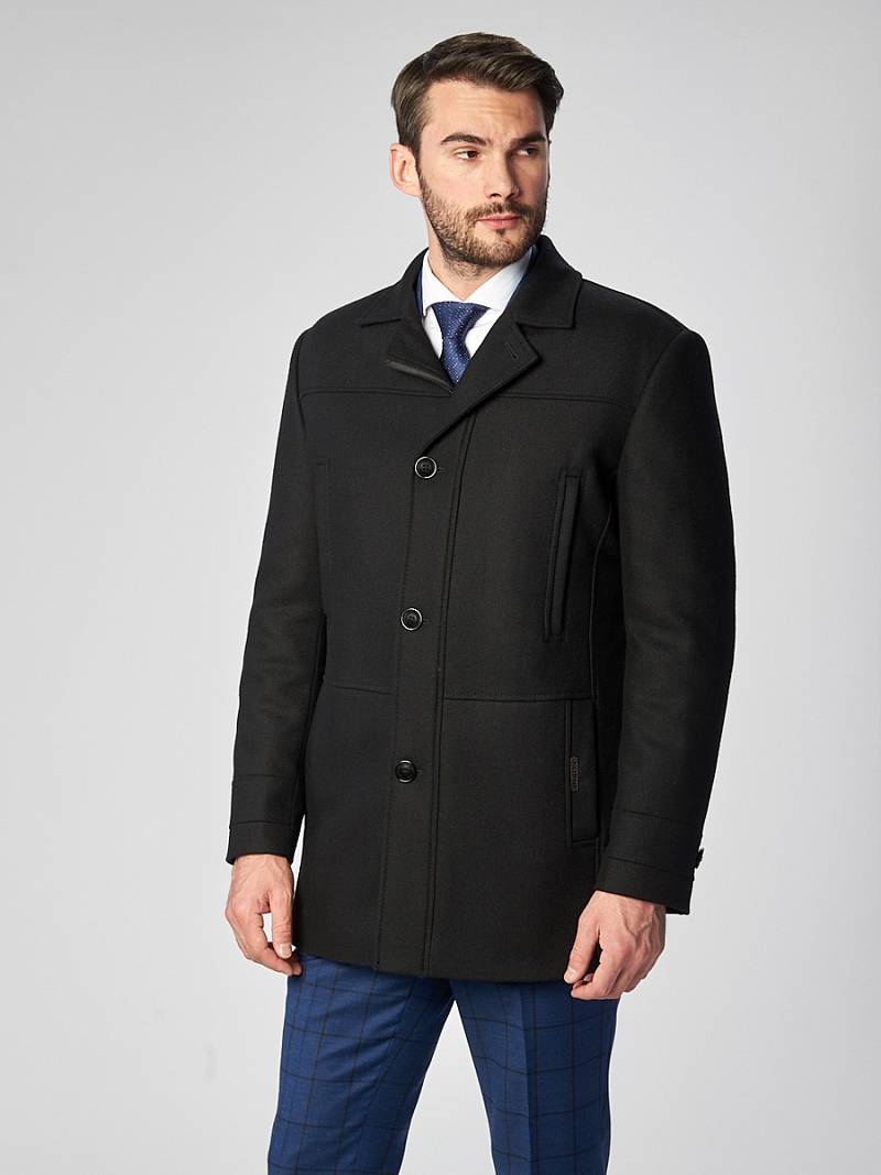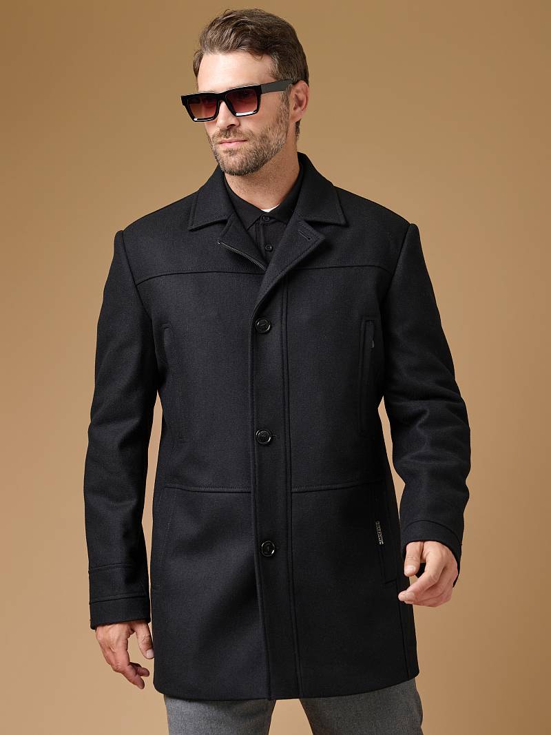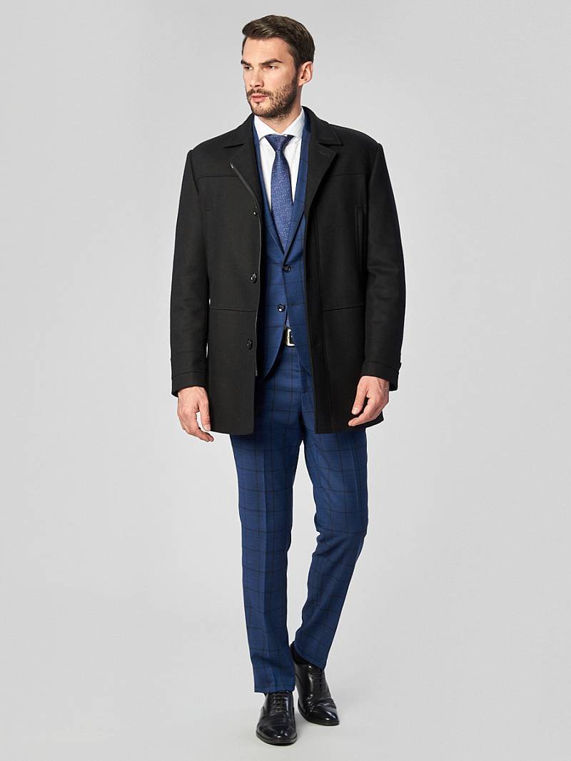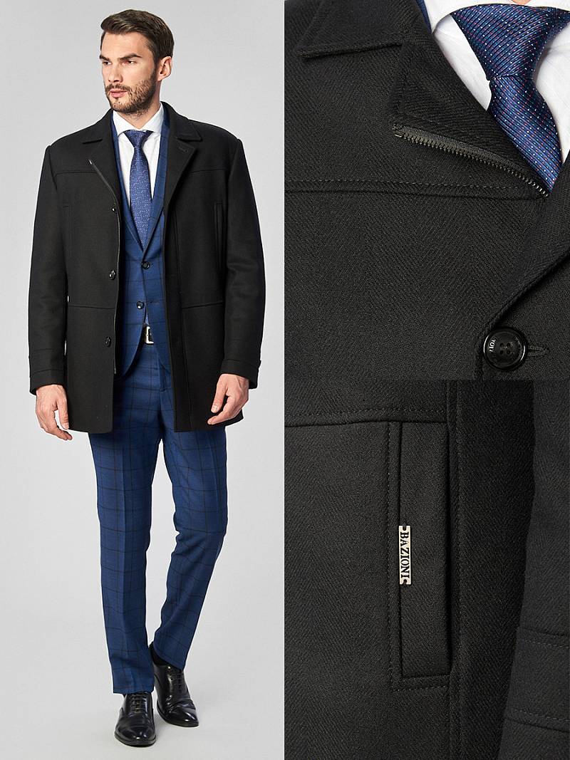 Пальто мужское утепленное с центральной застежкой на молнию и на 3 пуговицы. Полочки - резные состоят из трех частей: кокеток, средней части и нижней части. Спинка с кокетками и бочками. На средней полочке - верхние прорезные карманы на молнию. На нижней части полочек - боковые прорезные карманы с листочками. Спинка со средним швом и шлицей и рельефными швами. Рукава втачные, по низу передней части рукавов - притачная деталь-пата. В швах притачивания подбортов - отделочный кант.