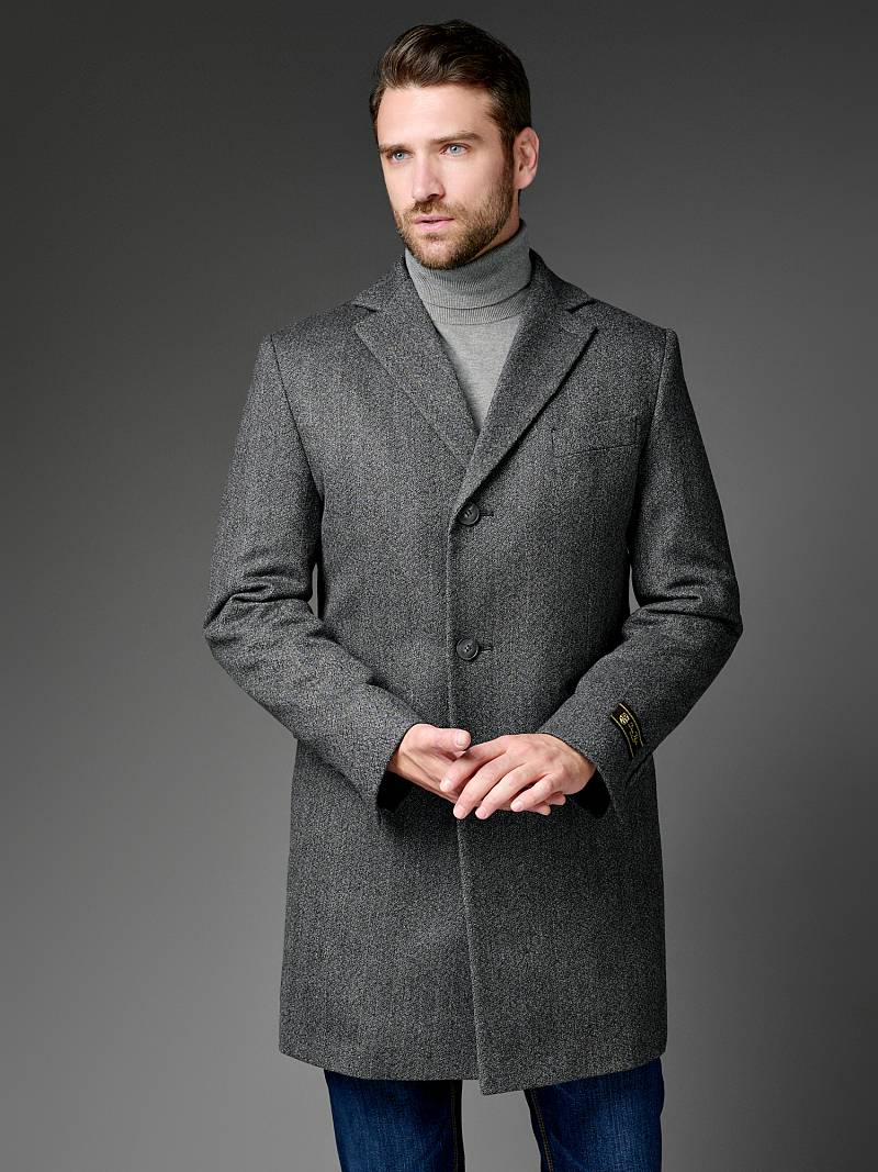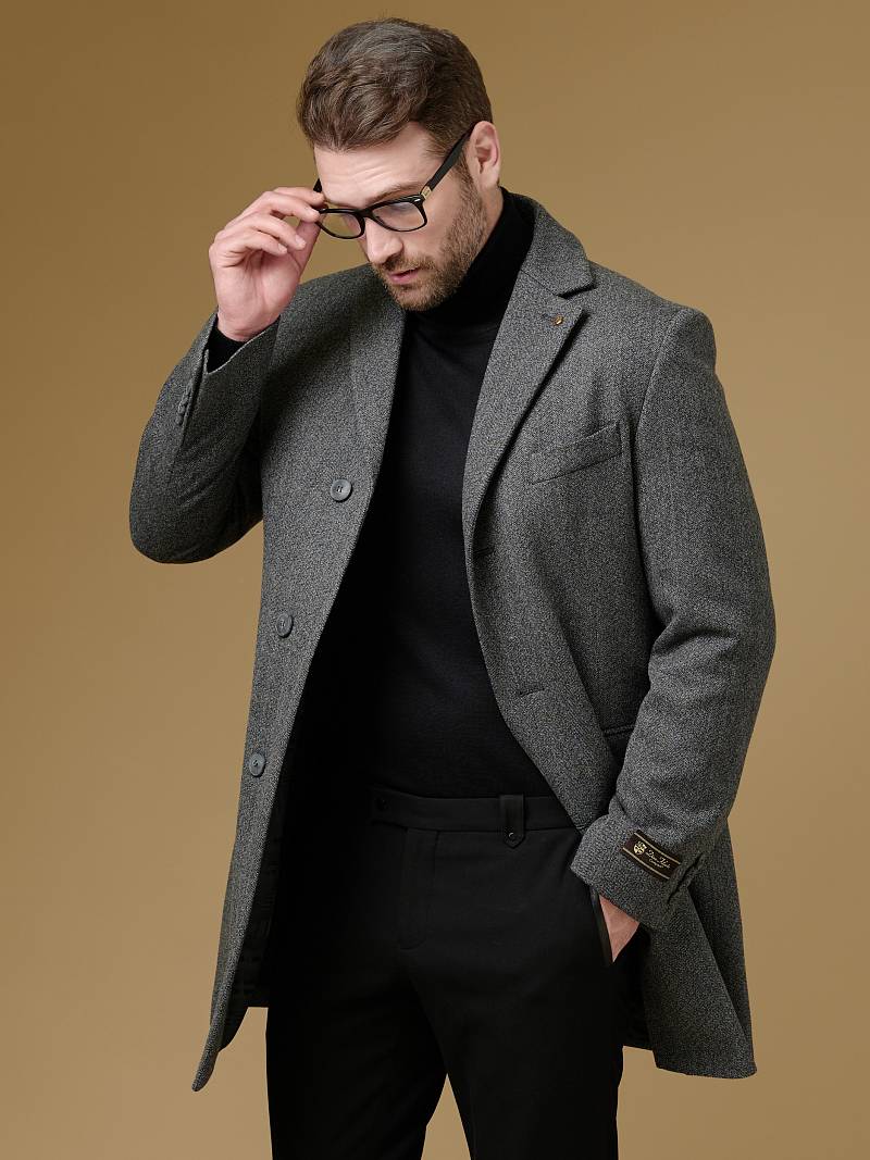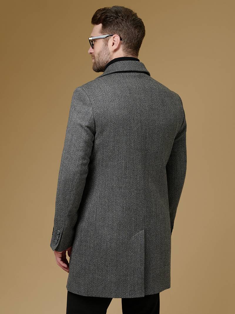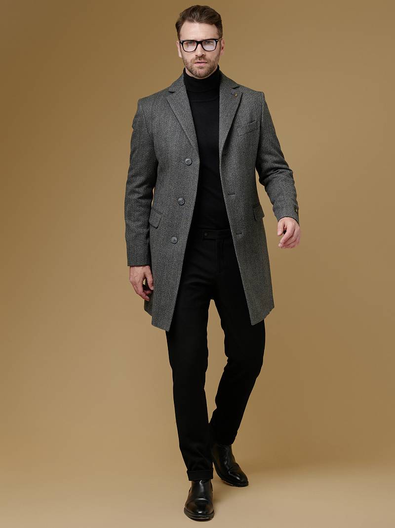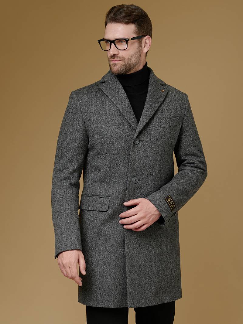 Классическое утепленное пальто (ПОЛУПРИЛЕГАЮЩИЙ СИЛУЭТ). Центральная застежка на 3 пуговицы, на полочке расположены два боковых кармана с клапанами и одной нагрудной листочкой. Рукав втачной, двухшовный, со шлицей и четырьмя декоративными пуговицами. По спинке расположена одна шлица. Пальто на подкладке с двумя внутренними карманами. Утеплитель: спинка-полочка-100г, рукава-60г.