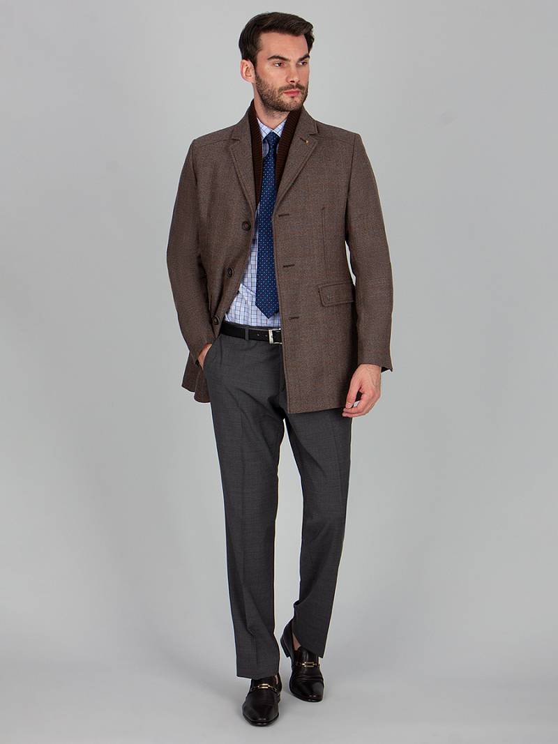 Пальто мужское, центральная застёжка на 3 пуговицы, Воротник английский +воротник трикотажный не отстегивается, боковые карманы с клапаном, рукав втачной, спинка со средним швом, одна шлица. На подкладке два внутренних кармана на пуговицах. Длина изделия по спинке для роста 176 - 85см. Ткань верха: 100%шерсть. Подкладка: 50%вискоза 50%полиэстер. Утеплитель: термоплюс 60гр