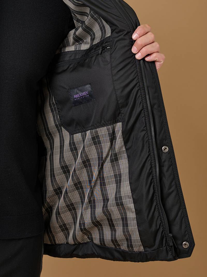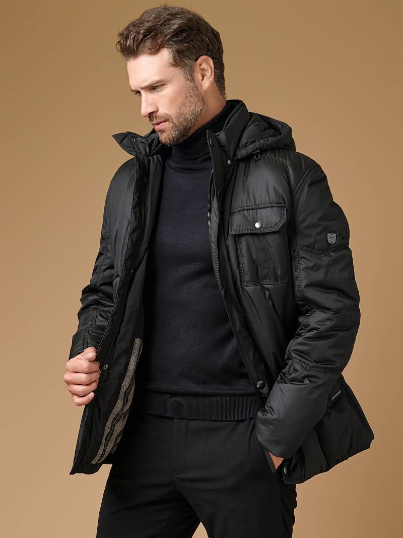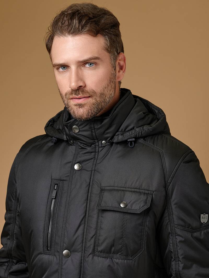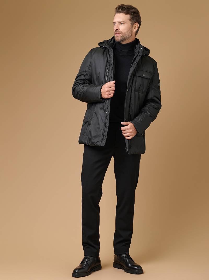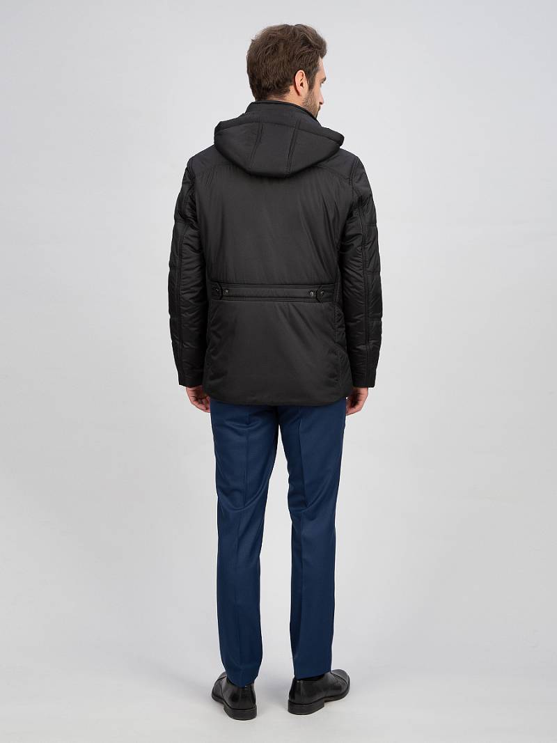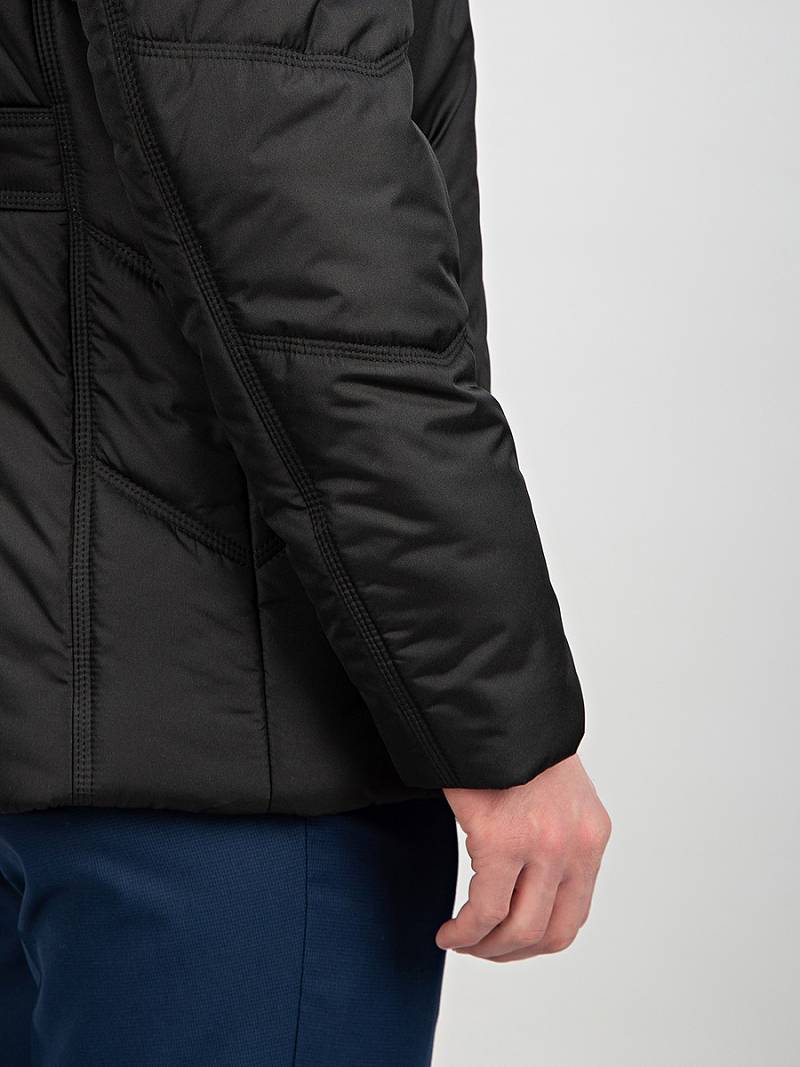 Куртка мужская утепленная с капюшоном. Воротник-стойка, нижний воротник - из трикотажа. На полочках - два верхних кармана и два нижних прорезных кармана. По спинке на талии - настрочная деталь с патами на кнопках. На полочках и спинке - отделочные строчки, имитирующие фигурные кокетки. На рукавах - также проложены отделочные строчки, которые придают рукавам эффект стежки. Длина изделия по спинке для роста 176 - 78см. Ткань верха: 100%полиэстер. Подкладка: 100%полиэстер. Утеплитель: термоплюс 200гр