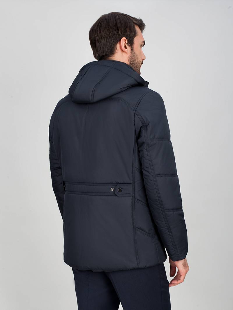 Куртка мужская утепленная с капюшоном. Воротник-стойка, нижний воротник - из трикотажа. На полочках - два верхних кармана и два нижних прорезных кармана. По спинке на талии - настрочная деталь с патами на кнопках. На полочках и спинке - отделочные строчки, имитирующие фигурные кокетки. На рукавах - также проложены отделочные строчки, которые придают рукавам эффект стежки. Длина изделия по спинке для роста 176 - 78см. Ткань верха: 100%полиэстер. Подкладка: 100%полиэстер. Утеплитель: термоплюс 200гр