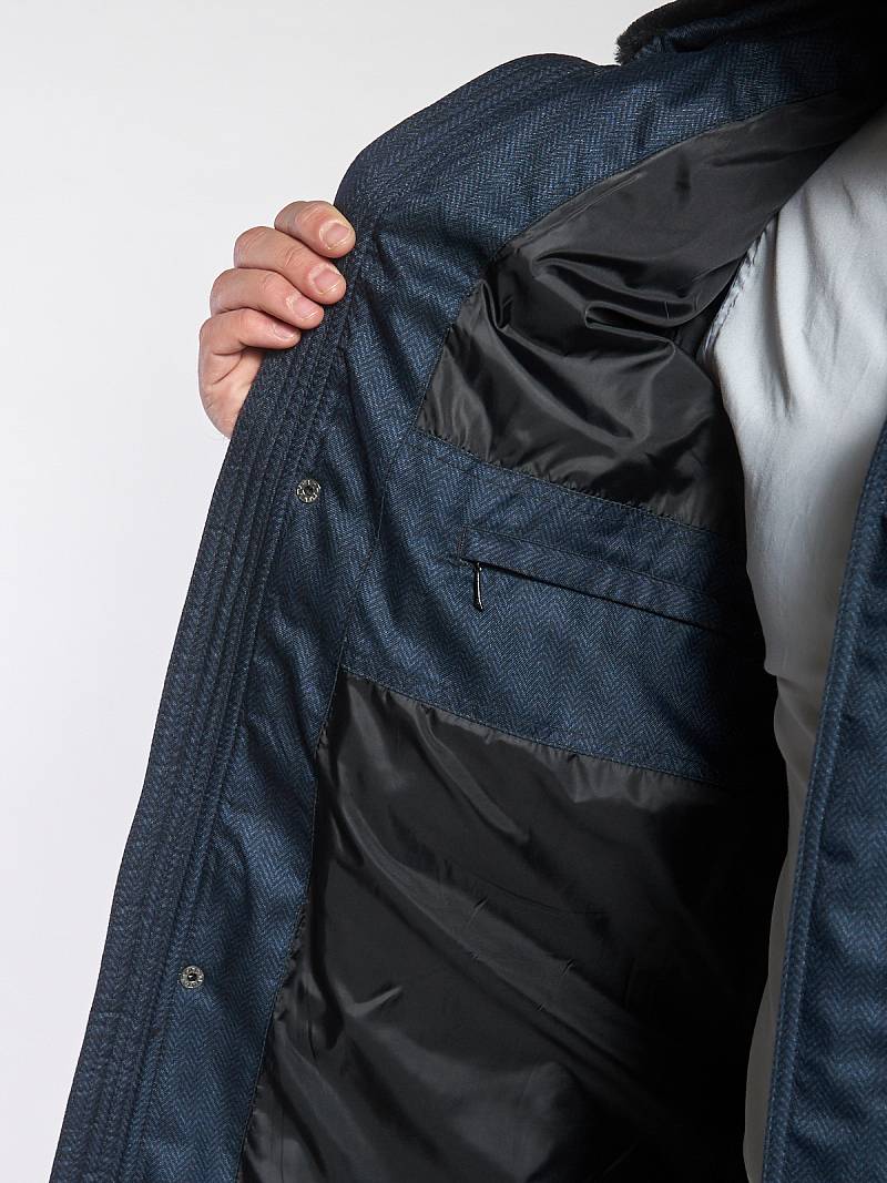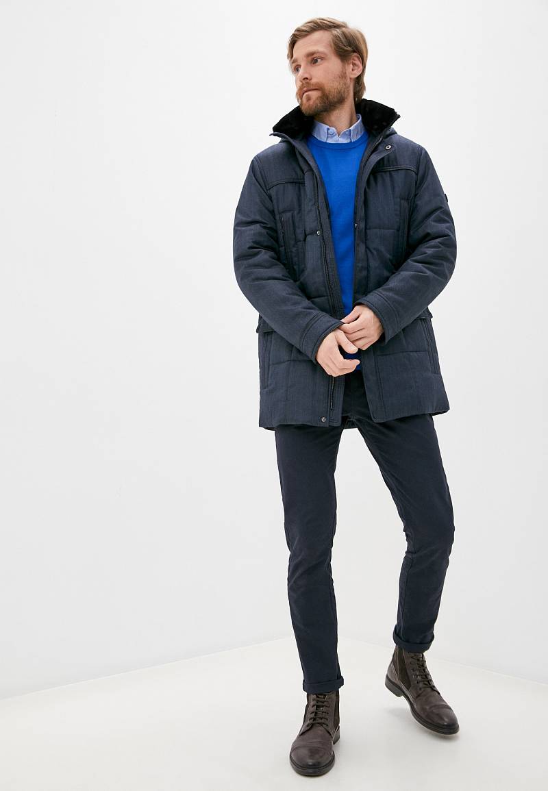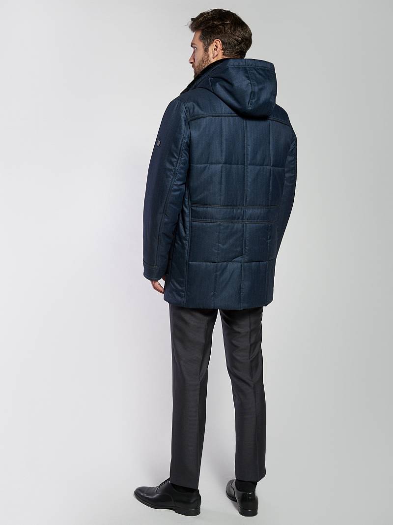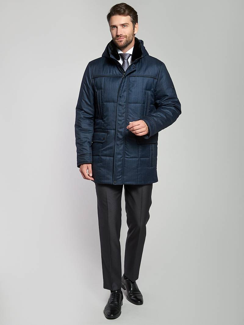 Куртка мужская утепленная с капюшоном из плащевой ткани с центральной застежкой на молнию и ветрозащитную планку на 4 кнопки. Воротник - стойка, также есть меховой пристегивающийся воротник. Простеганные полочки и спинка- с кокетками и бочками. На полочках - верхние карманы с листочками на молниях и два нижних боковых кармана: 1- с клапаном, 2-ой - с листочкой. В нижней части средlнего шва спинки- шлица на 2-х кнопках. По талии спинки-притачная кулиса, регулирующая кнопками. Рукава втачные с локтевыми швами. По швам притачивания кокеток, краю листочек, клапанов, по низу рукавов, по кулисе на спинке - объемный отделочный кант. На подкладке - два внутренних кармана с листочками. Длина по спинке-80см. Ткань верха: 60%шерсть, 40%полиэстер. Подкладка: 100%полиэстер. Утеплитель: термоплюс 200гр./200гр. Воротник: мех