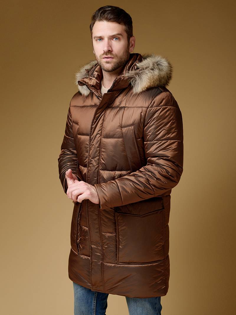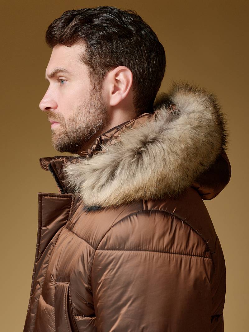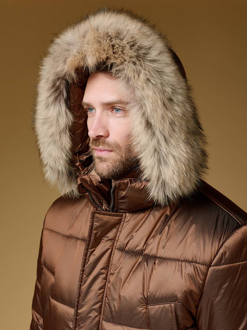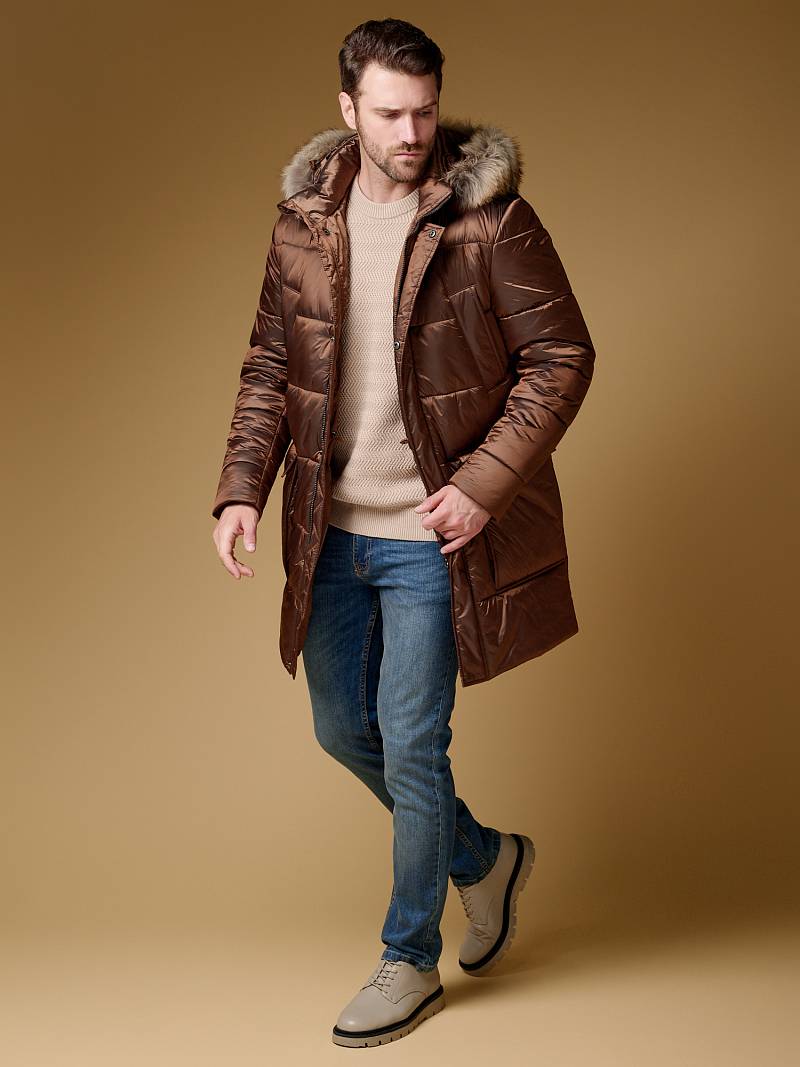 Куртка мужская из курточной ткани с отстегивающимся капюшоном, застежка на потайные кнопки и молнию. Инновационная пуходержащая ткань верха с обработкой wr, cire (ветро и влаго защита). - мягкая, легкая, практичная, не мнется, имеет эффект- благородный блеск. На капюшоне - остегивающаяся меховая опушка, сзади - внизу две кнопки для регулировки глубины натяжения капюшона. Воротник стойка. Ветрозащитная планка на потайных кнопках. Застежка классическая молния YKK на один - два замка. Вместительные, утепленные велюром накладные карманы, оборудованы клапанами на магнитах для защиты от дождя и снега, у кармана есть дополнительный вход сбоку. Также имеются нагрудные карманы на магнитах. Рукава на удобных теплых трикотажных манжетах. Утеплитель антиаллергенный термоплюс 250 гр / 210гр. не теряет своих свойств после химчистки и стирки. Длина по спинке для размера 50/176 - 95см. Ткань верха: 100%нейлон. Подкладка: 100% полиэстер. Утеплитель: термоплюс 250гр/210гр. Опушка: мех натуральный-ФИНСКИЙ АУКЦИОННЫЙ ЕНОТ.