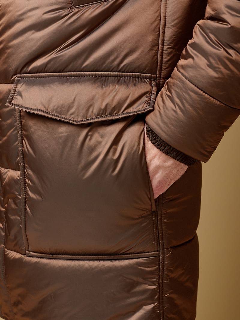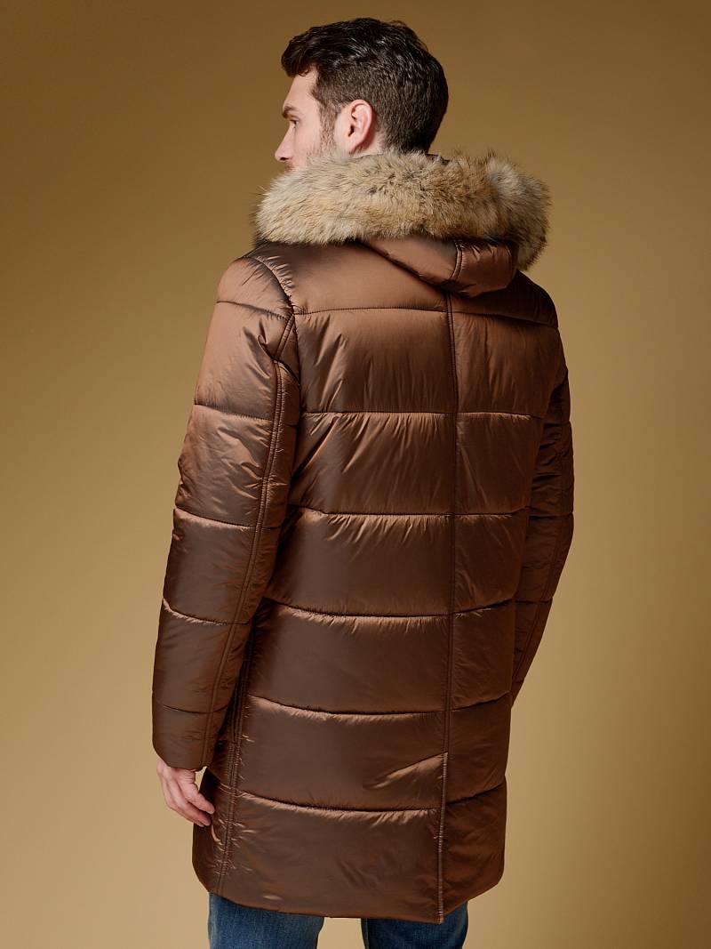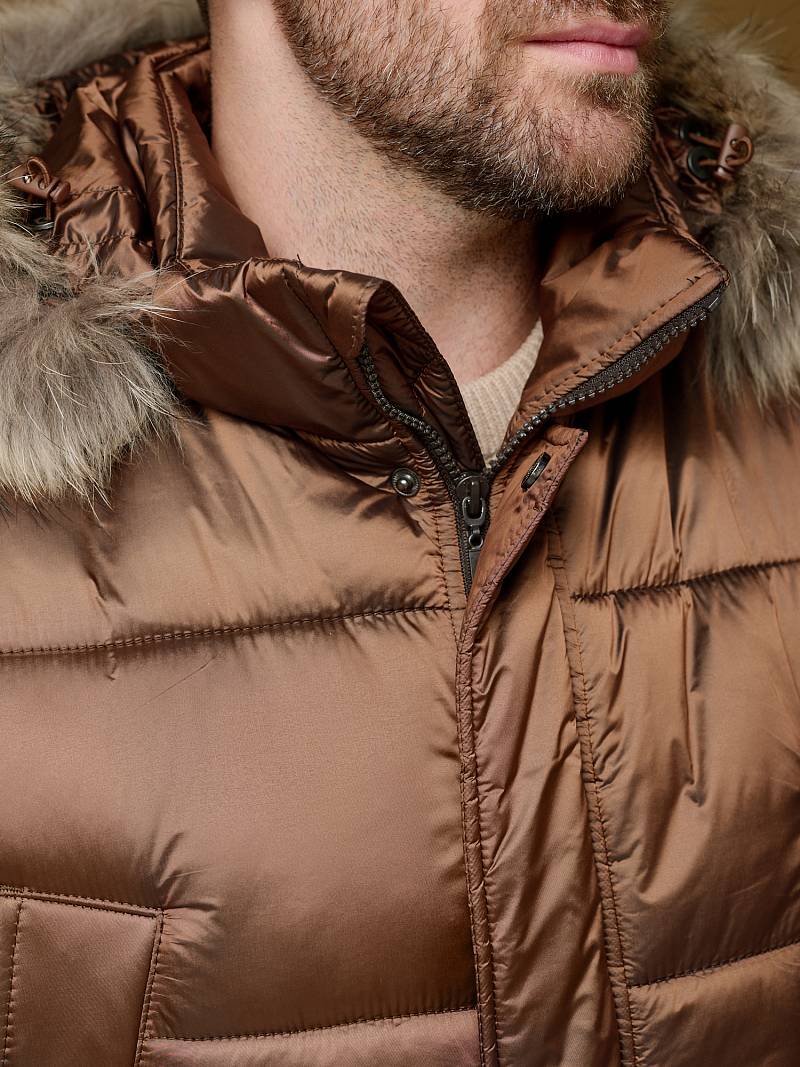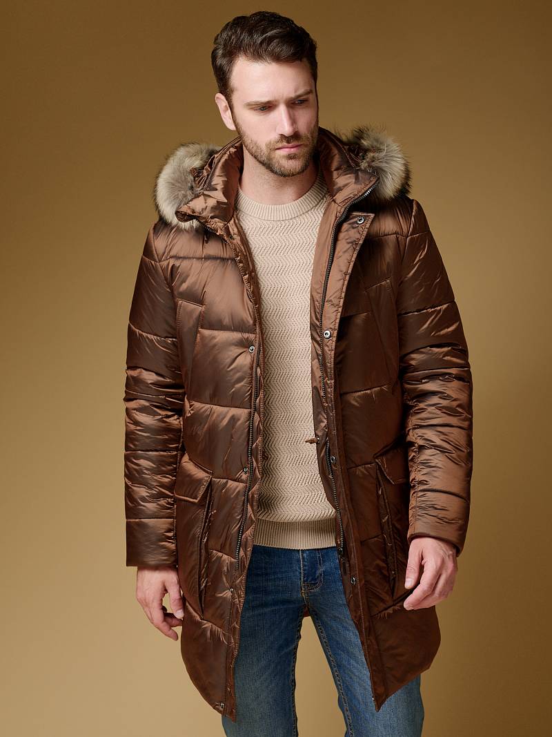 Куртка мужская из курточной ткани с отстегивающимся капюшоном, застежка на потайные кнопки и молнию. Инновационная пуходержащая ткань верха с обработкой wr, cire (ветро и влаго защита). - мягкая, легкая, практичная, не мнется, имеет эффект- благородный блеск. На капюшоне - остегивающаяся меховая опушка, сзади - внизу две кнопки для регулировки глубины натяжения капюшона. Воротник стойка. Ветрозащитная планка на потайных кнопках. Застежка классическая молния YKK на один - два замка. Вместительные, утепленные велюром накладные карманы, оборудованы клапанами на магнитах для защиты от дождя и снега, у кармана есть дополнительный вход сбоку. Также имеются нагрудные карманы на магнитах. Рукава на удобных теплых трикотажных манжетах. Утеплитель антиаллергенный термоплюс 250 гр / 210гр. не теряет своих свойств после химчистки и стирки. Длина по спинке для размера 50/176 - 95см. Ткань верха: 100%нейлон. Подкладка: 100% полиэстер. Утеплитель: термоплюс 250гр/210гр. Опушка: мех натуральный-ФИНСКИЙ АУКЦИОННЫЙ ЕНОТ.