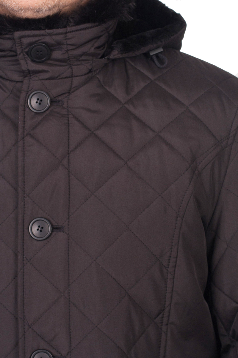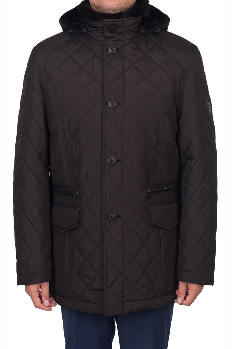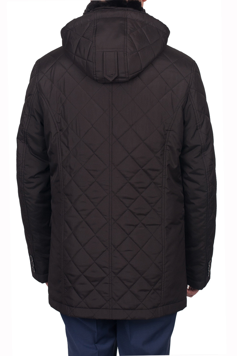 Куртка из стёганной ткани на подкладкой из меха, воротник стойка, съёмный капюшон. Карманы с клапанами и на молнии. Длина изделия по спинке для роста 176 - 80см. Ткань верха: 100% полиэстер. Подкладка съемн мех: 80% шерсть, 20% пан. Утеплитель: 100гр