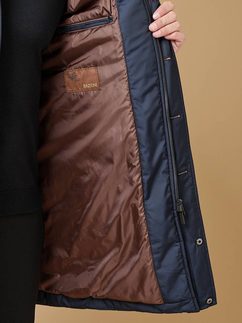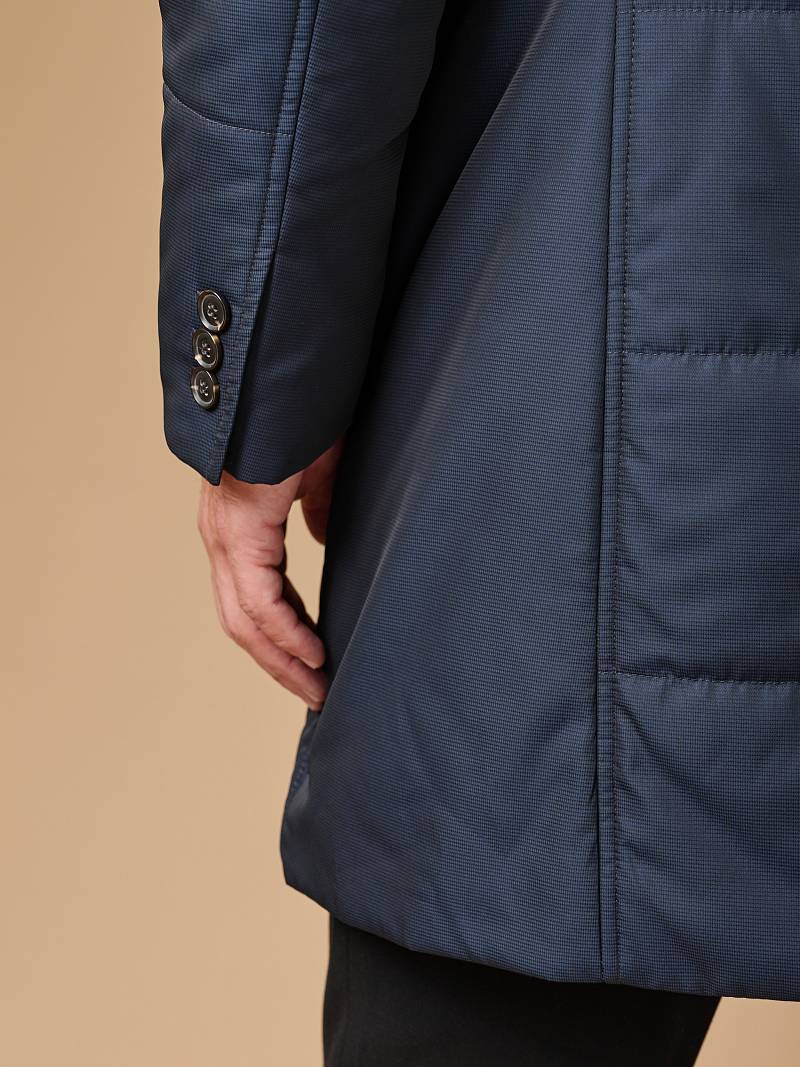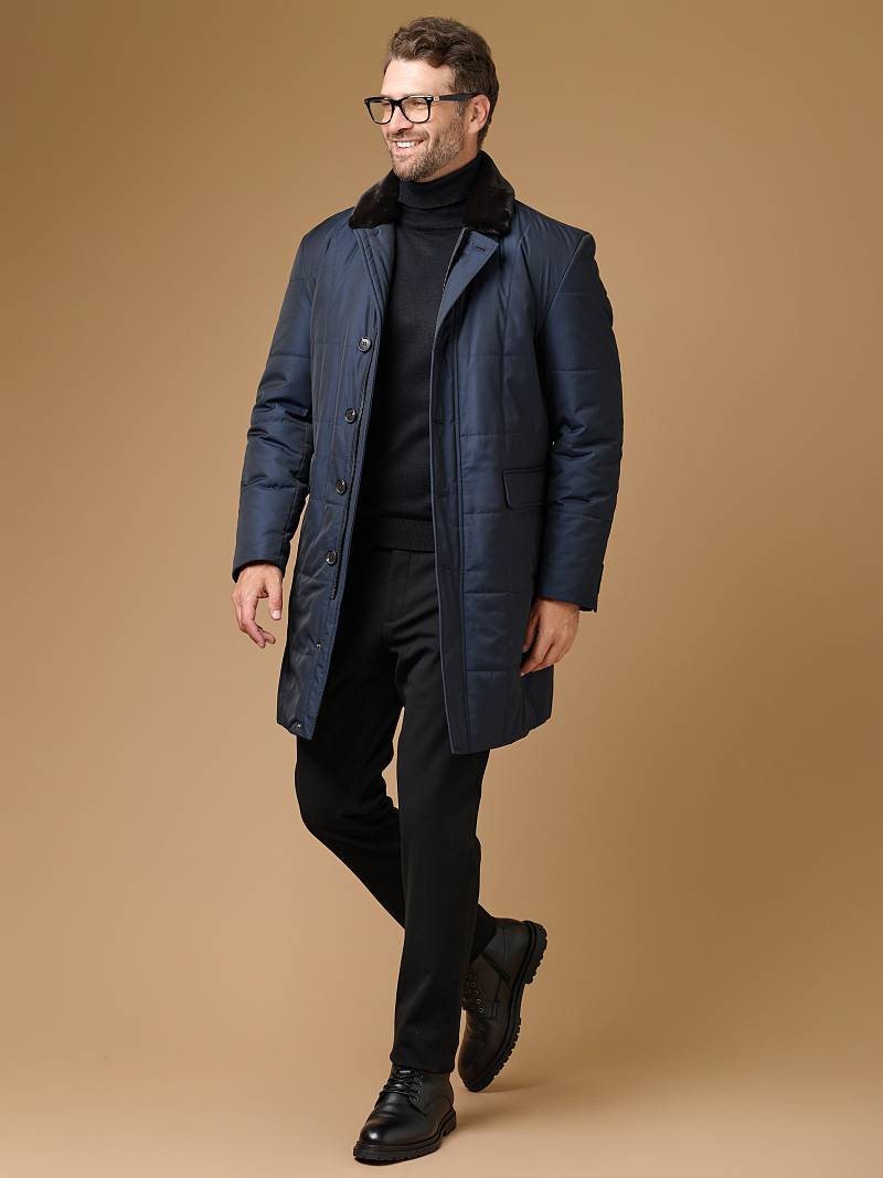 Мужская куртка-пальто утепленная с застежкой на молнию и 4 пуговицы. Воротник - меховой вшивной . Спинка, полочки и передняя часть рукавов простеганы стежкой "квадрат". Спинка со шлицей в среднем шве. Полочки с бочками, на полочках - два нижних боковых кармана с клапанами на магнитах. На левом рукаве нашивка герб. На подкладке- два внутренних кармана на пуговицах. Длина изделия по спинке для роста 176 - 95см. Ткань верха: 100%полиэстер. Подкладка: 100%полиэстер. Утеплитель: термоплюс 200гр/160гр. Воротник: мех