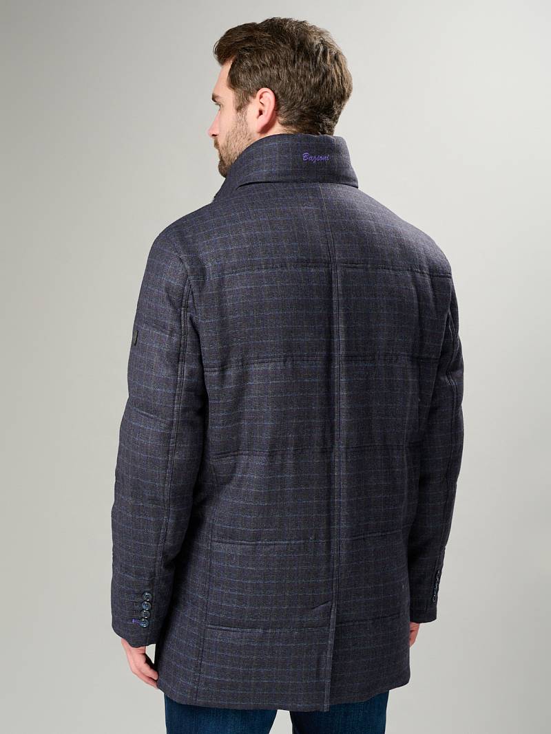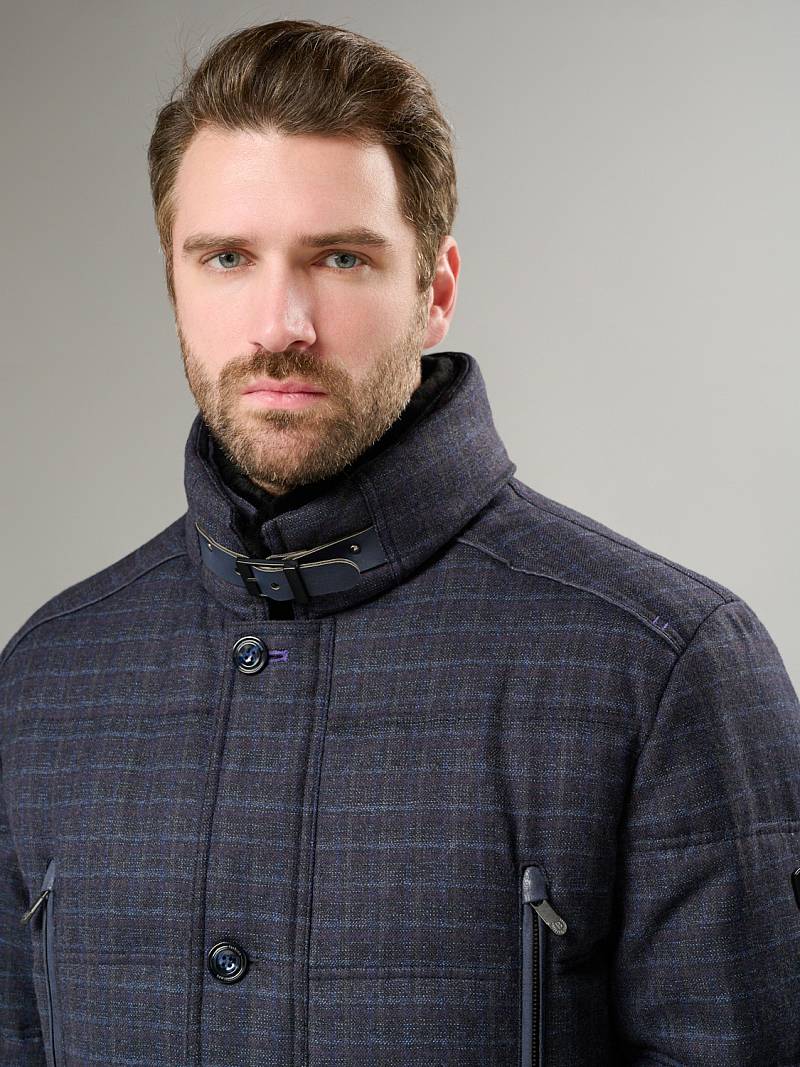 Куртка мужская утепленная со съемным меховым натуральным воротником, застежка на молнию и ветрозащитную планку на 5 пуговиц. Спинка, полочка и рукава простеганы горизонтальными двойными отделочными строчками. На полочках- два нагрудных кармана в рамку на молнию и два нижних боковых наклонных кармана с листочками. Спинка со средним швом и одной шлицей на двух потайных кнопках. На левом рукаве - герб-нашивка. Рамки нагрудных карманов, кант в кокетках полочек и кант в листочках - из отделочной ткани. На подкладке два внутренних кармана на молнии и один карман на пуговице, по линии талии на подкладке - отделочная фирменная тесьма. Длина изделия по спинке для роста 176- 85см. Ткань верха: 100%шерсть. Подкладка: 100% полиэстер. Утеплитель: Био-пух 100% (220гр) Воротник: мех натуральный мутон