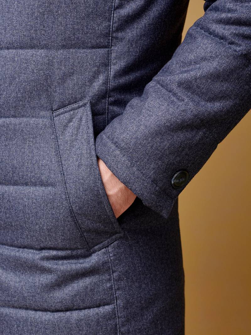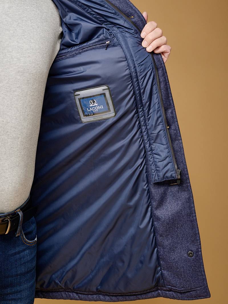 Куртка мужская утепленная с отстегивающийся манишкой на молнию. Застежка куртки на 6 пуговиц. Воротник - стойка. Полочки, спинка, рукава- простеганы горизонтальной стежкой. На полочках - два нижних боковых кармана с листочками. В нижней части среднего шва спинки- шлица на 2-х кнопках. Рукава втачные с локтевыми швами. На подкладке - два внутренних прорезных кармана на молниях. Длина по спинке для размера-роста 50/176 - 95см. Ткань верха: 60%шерсть, 40%полиэстер. Подкладка: 100%полиэстер. Утеплитель: термоплюс 200гр./160гр.