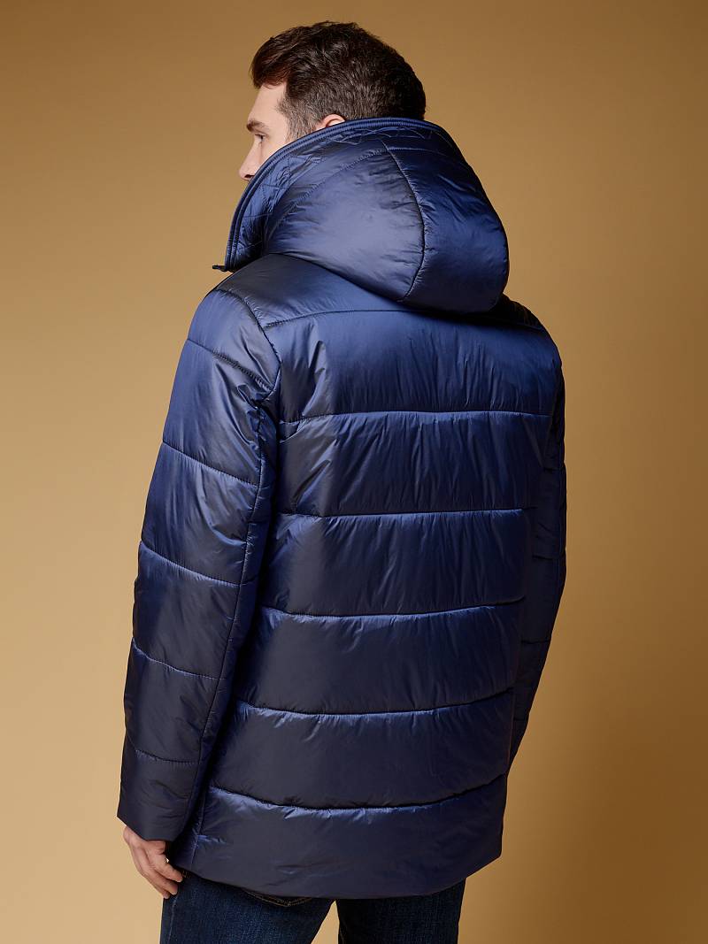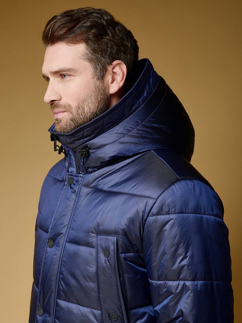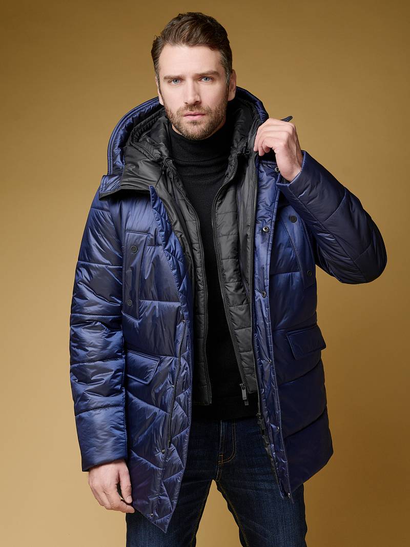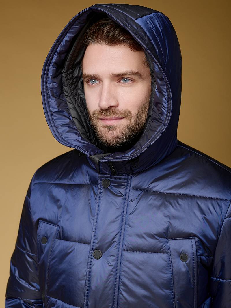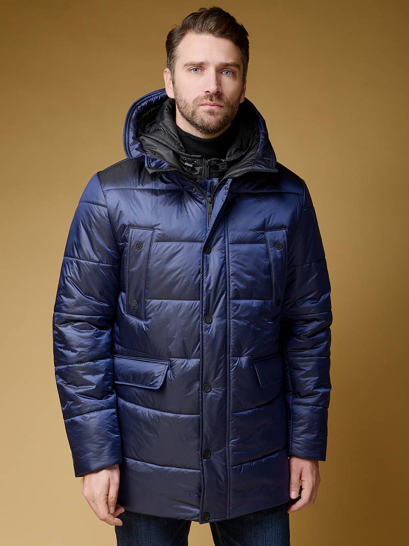 Куртка мужская из пуходержащей ткани с водоотталкивающей пропиткой WR, CIRE с высокой степенью влаго- и ветрозащитой. Ткань верха - легкая и имеет эффект- благородный блеск. Изделие - c двойным капюшоном и съемной манишкой, манишка с капюшоном - из отделочной ткани. Полочки, спинка, рукава- простеганы горизонтальной стежкой. На полочках - два нагрудных кармана с листочками и два нижних боковых кармана с клапанами на скрытых магнитах. Рукава втачные с локтевыми швами. На подкладке - два внутренних прорезных кармана на молниях. Длина по спинке для размера-роста 50/176 - 84см. Ткань верха: 100%нейлон. Подкладка: 100%полиэстер. Утеплитель: термоплюс 250гр/210гр.