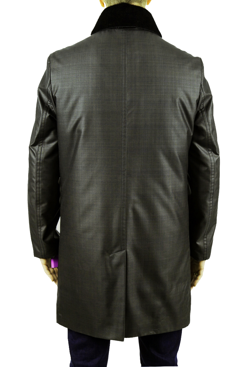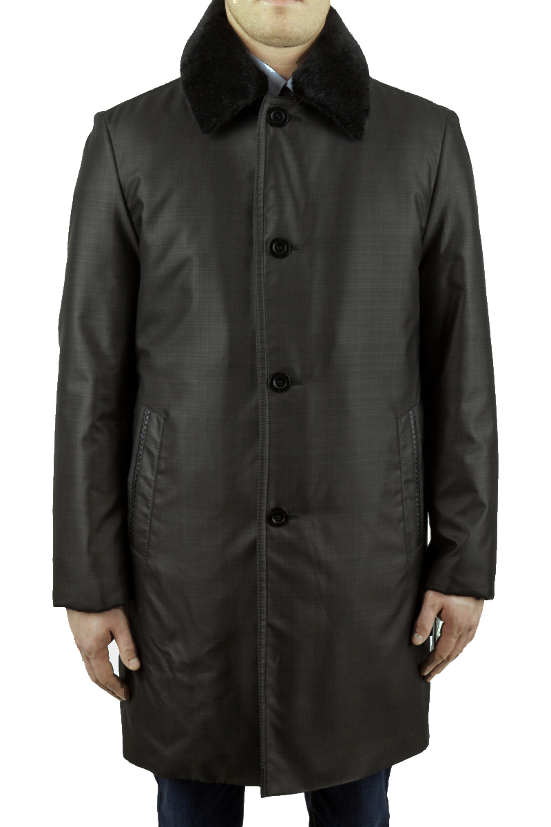 Плащ-пальто мужское прямого силуэта. Воротник отложной с мехом. Меховой воротник исусственный- сьемный на пуговицах. Застежка изделия на пуговицах, на полочках - прорезные карманы с листочками. Спинка со средним швом и шлицей.