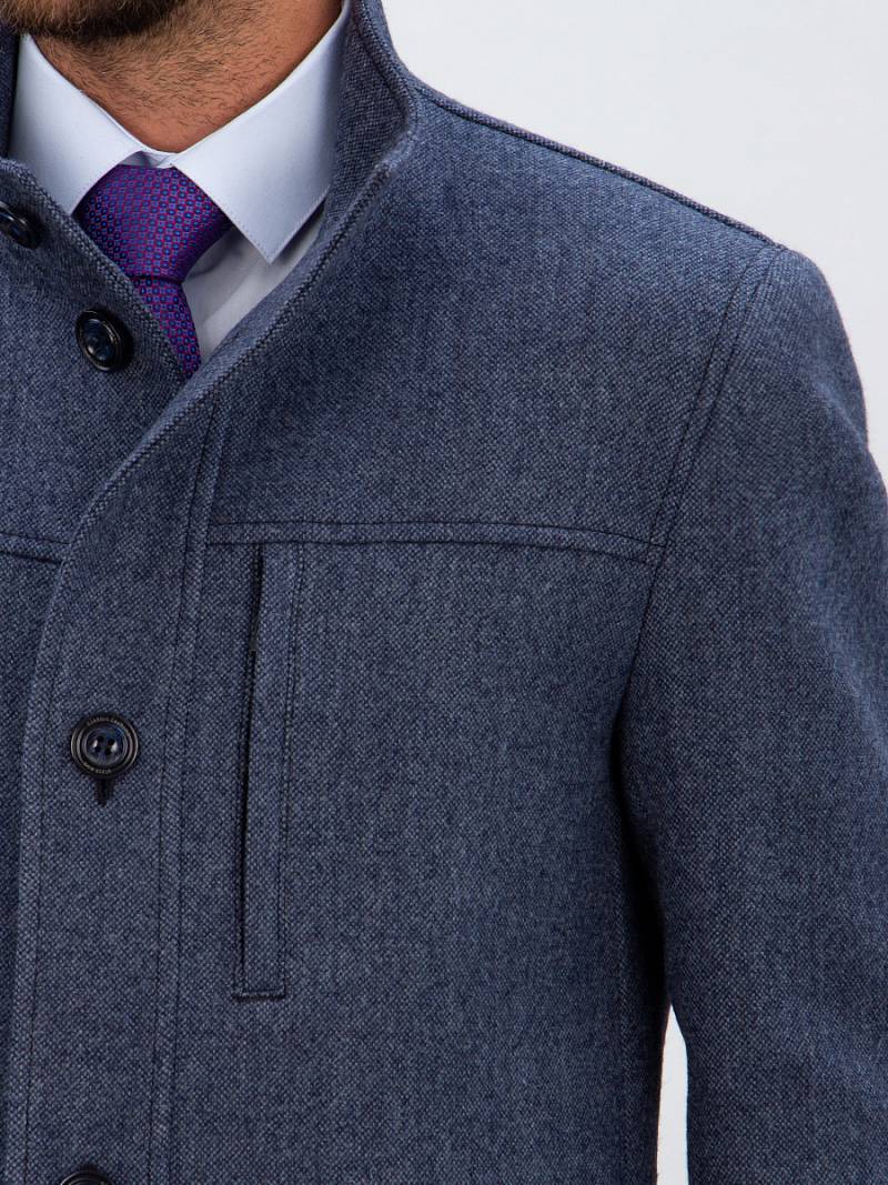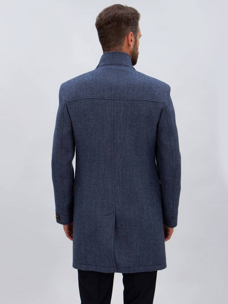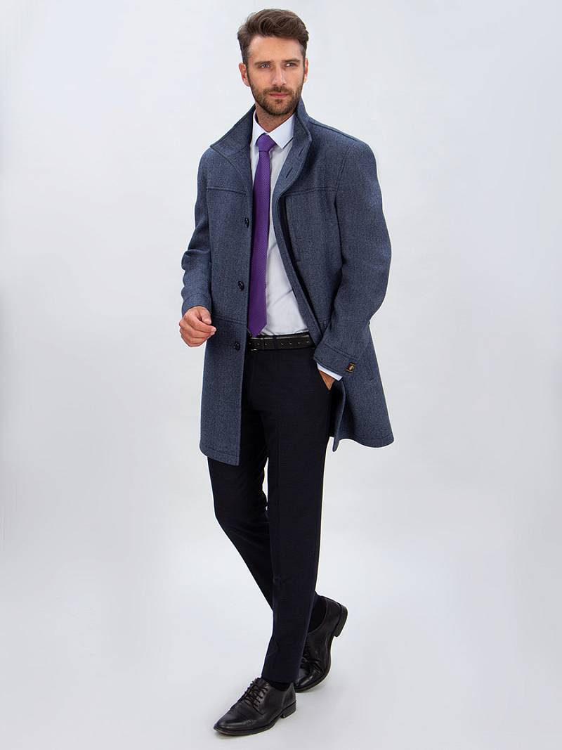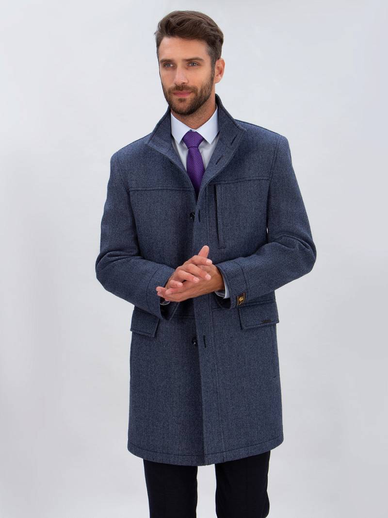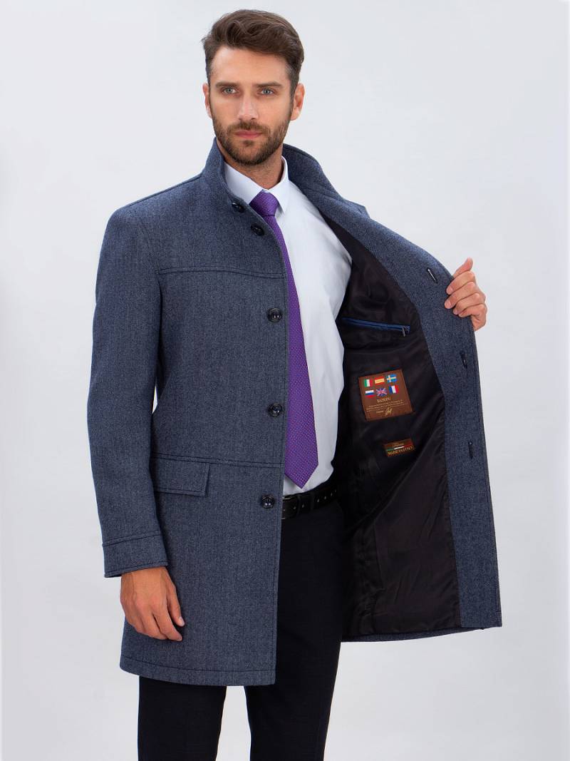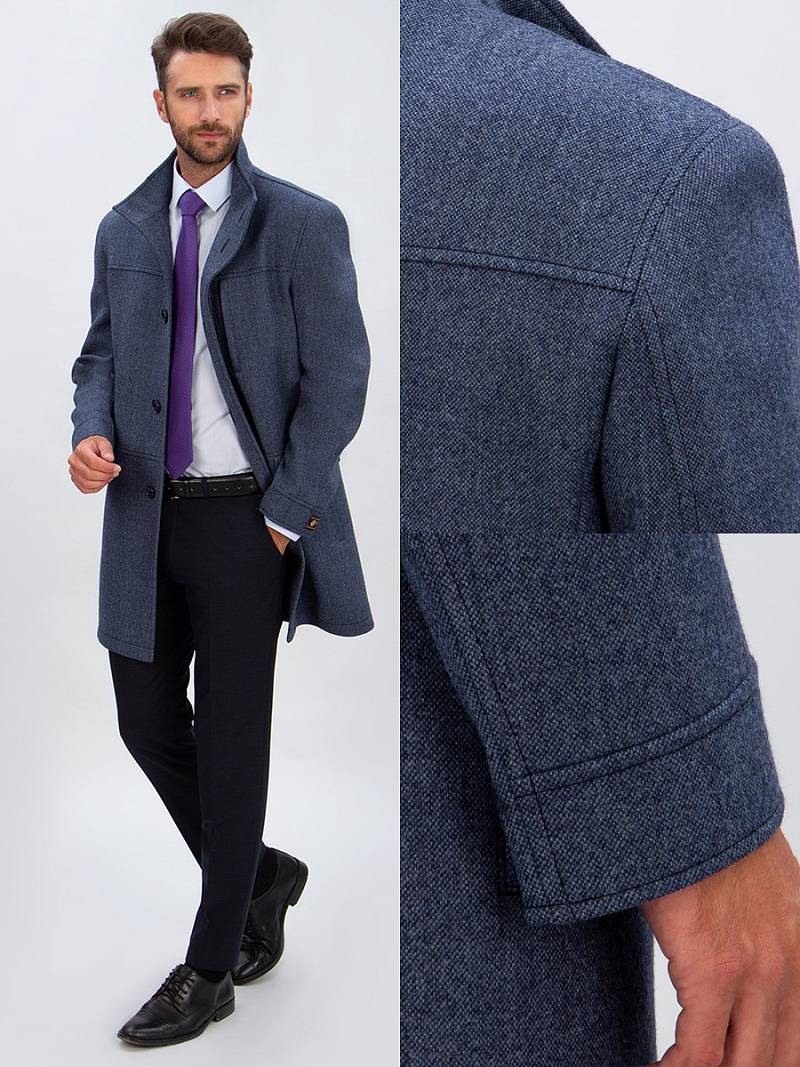 Пальто мужское прямого силуэта без утеплителя , центральная застежка на 5 пуговиц. Полочка состоит из трех частей. На полочках: верхний нагрудный карман с листочкой на молнии и в нижней части полочек- прорезные карманы с листочкой и карманы с клапаном в шве. Спинка с кокеткой и со шлицей в среднем шве. По низу рукавов - притачная деталь. На клапане кармана- фирменная нашивка.