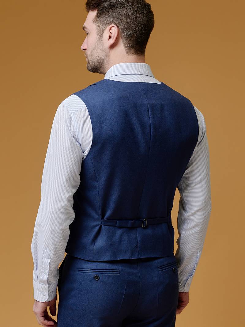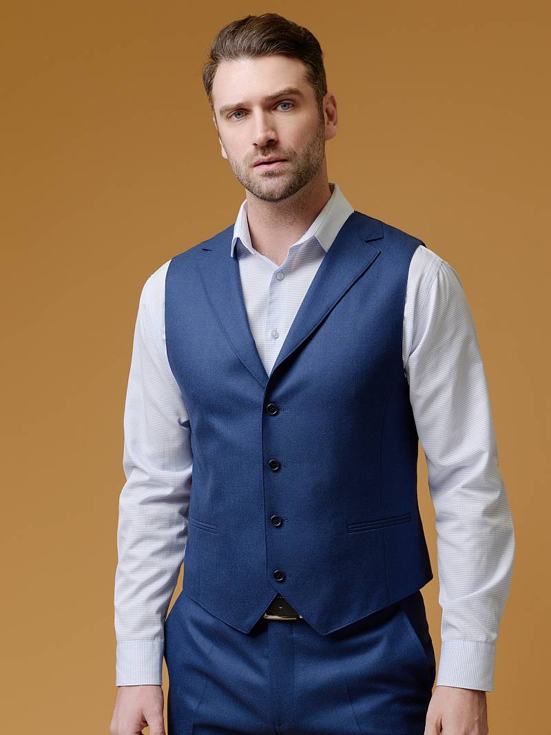 Slim fit (ПРИЛЕГАЮЩИЙ СИЛУЭТ), рекомендуется брать на размер больше. Жилет мужской классический, с имитацией воротника-лацкана, на полочках расположены два боковых кармана, по спинке расположен хлястик для регулировки объема в области талии.