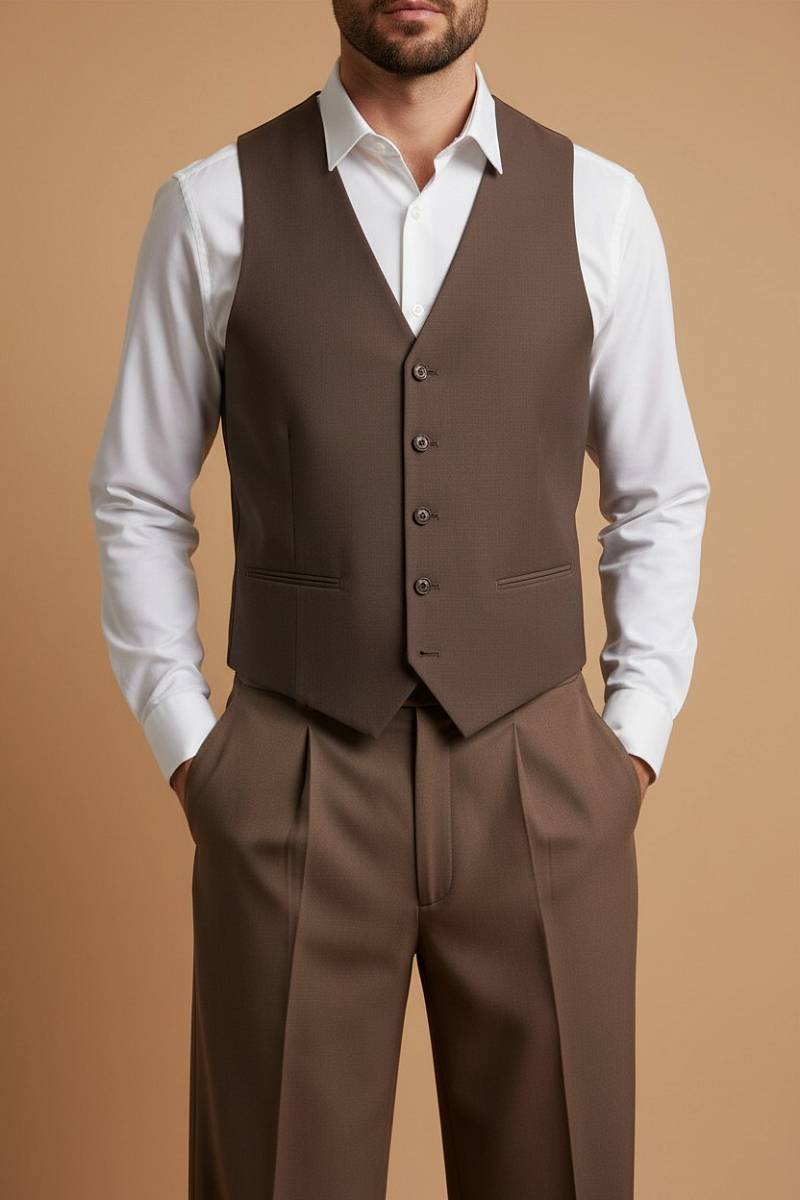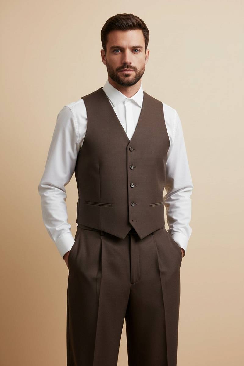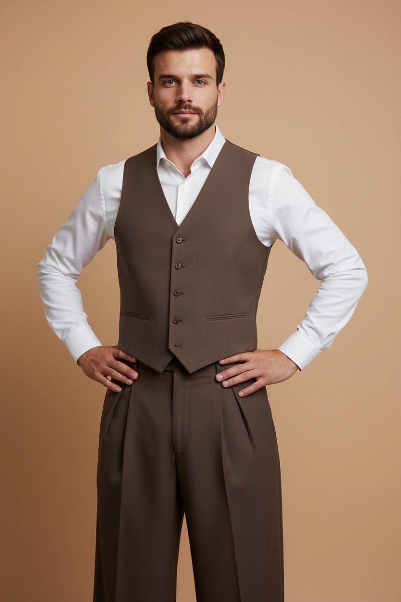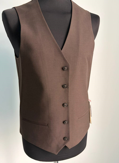 Classic fit (ПОЛУПРИЛЕГАЮЩИЙ СИЛУЭТ). Мужской классический жилет темно-коричневого цвета выполнен из полушерстяной ткани. На полочках расположены два боковых кармана, по спинке расположен хлястик для регулировки объема в области талии. Дизайнеры марки тщательно подходят к выбору материалов. Пуговицы подбираются и красятся индивидуально под каждую ткань, а прикладные материалы используют только от передовых производителей.