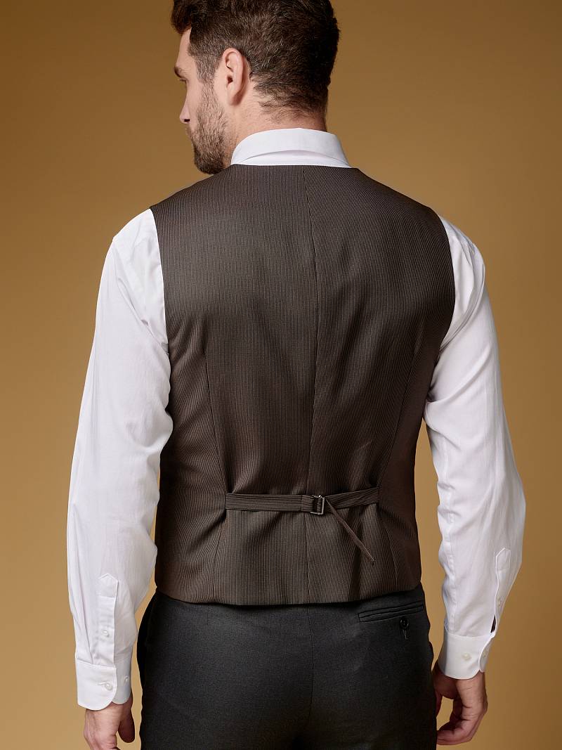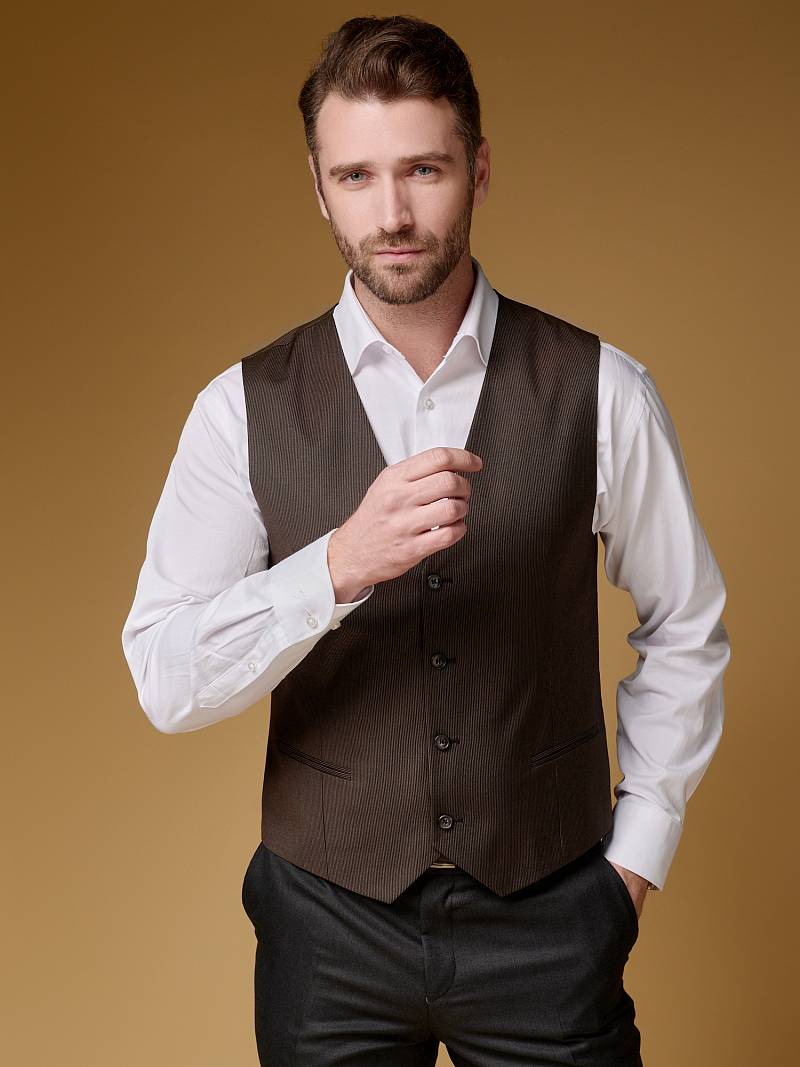 Classic fit (ПОЛУПРИЛЕГАЮЩИЙ СИЛУЭТ). Жилет мужской классический, с двумя боковыми карманами, по спинке расположен хлястик для регулировки объема в области талии.