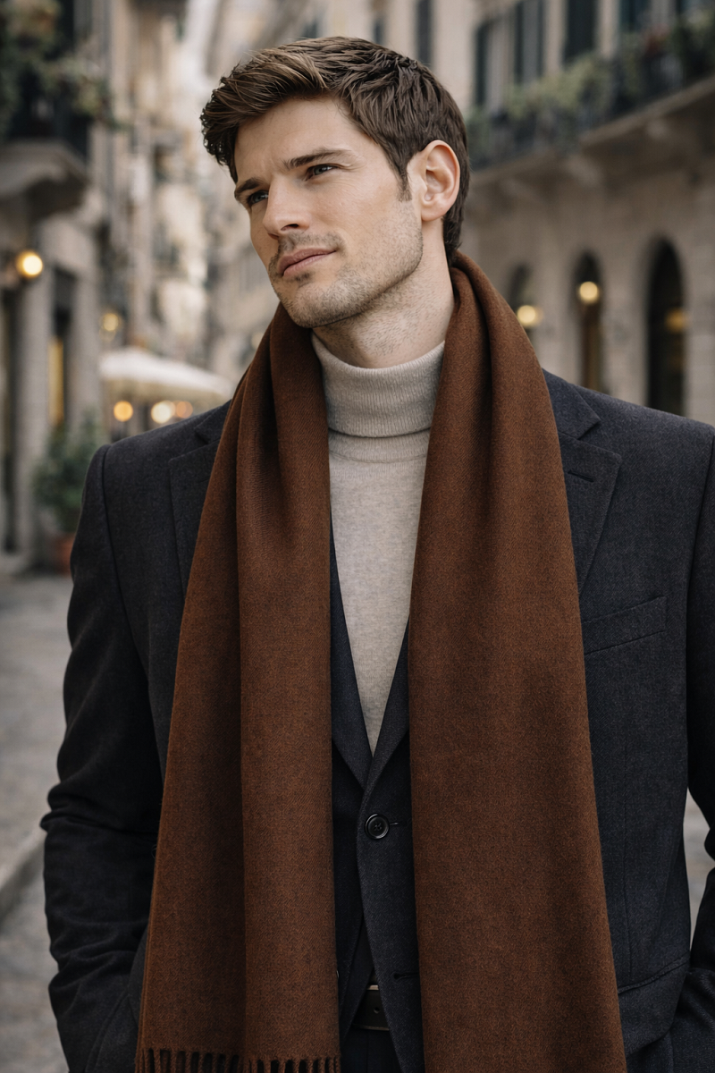 Основные характеристики: цвет — благородный коричневый (универсальный оттенок, который легко впишется в любой гардероб и подойдёт как для повседневных, так и для деловых образов); размеры — 30 см×164 см с дополнительными кистями по 8 см×2 (оптимальная длина позволяет экспериментировать с разными способами завязывания, а изящные кисти придают аксессуару особый шарм).
