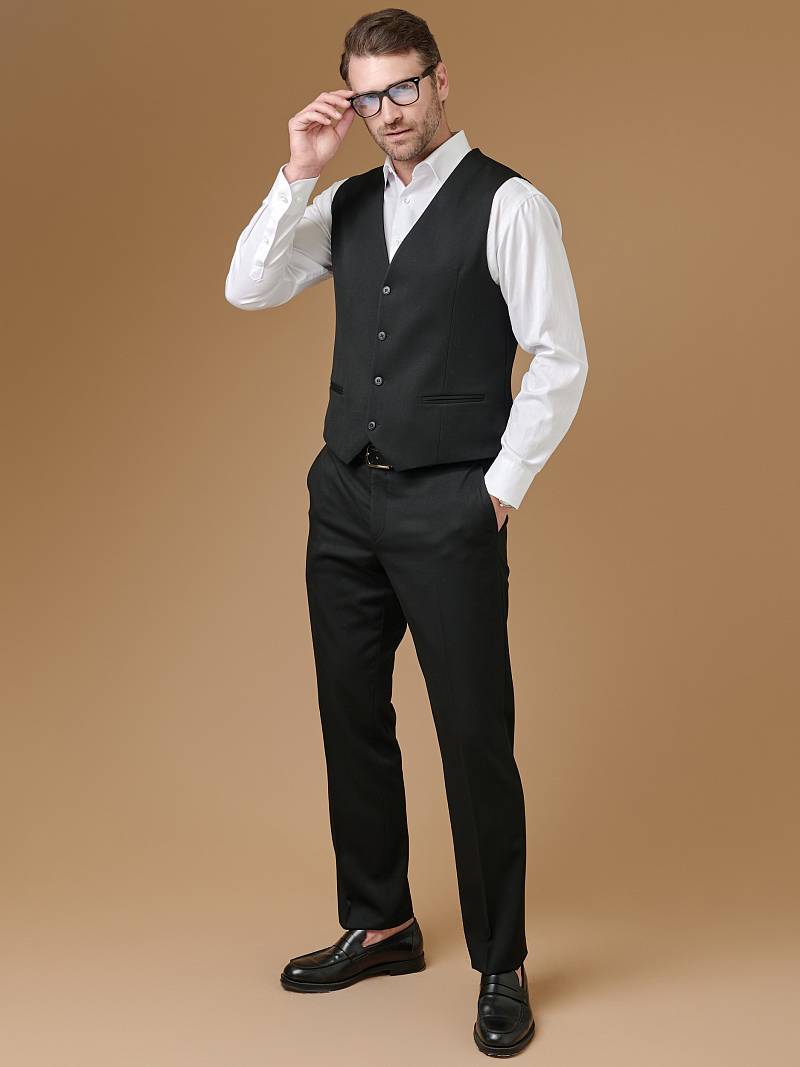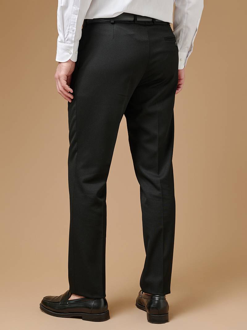 Classic fit (ПОЛУПРИЛЕГАЮЩИЙ СИЛУЭТ). Брюки без защипов, с боковыми наклонными карманами и двумя задними карманами «в рамку». Передние половинки на подкладке. Верхний срез брюк обработан поясом с корсажной лентой и шлевками под ремень. Застежка обработана на тесьму-молнию, с петлей-пуговицей на поясе и усилен металлическим крючком.