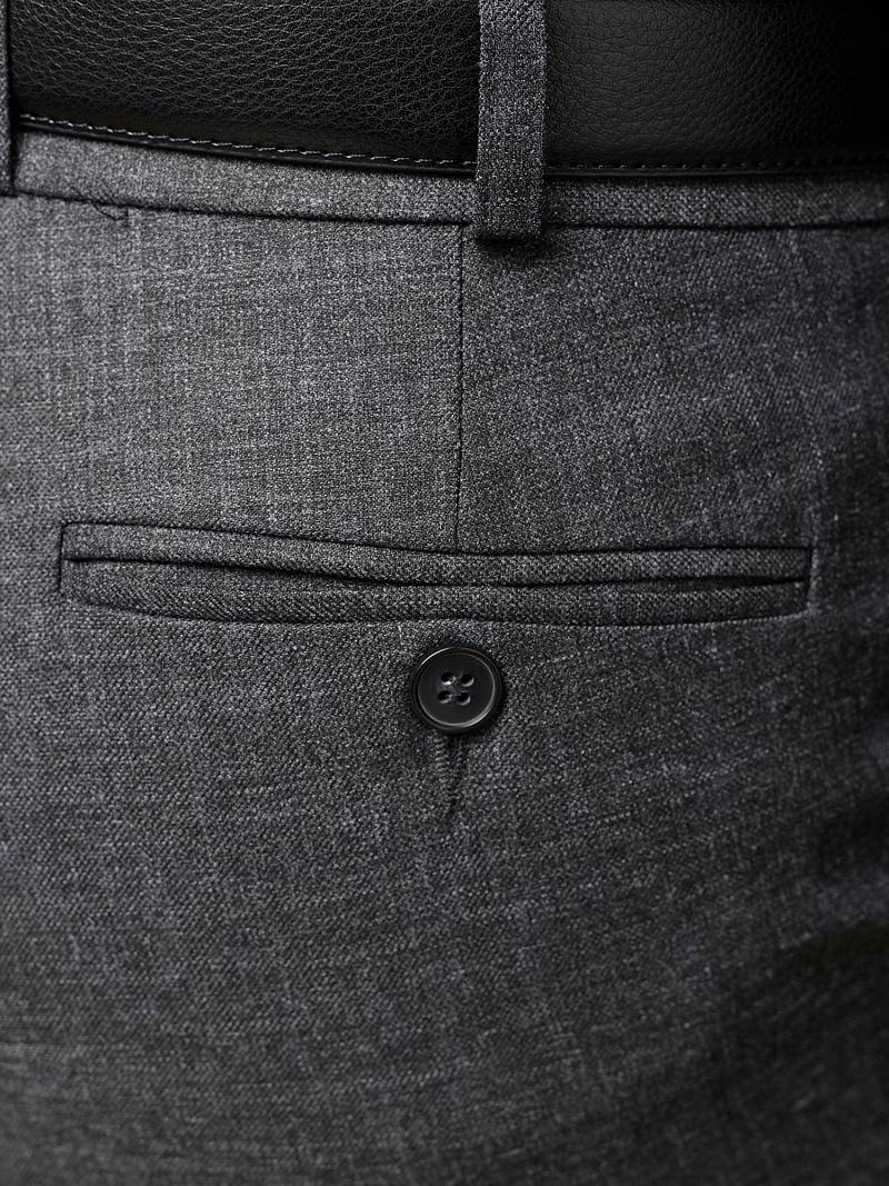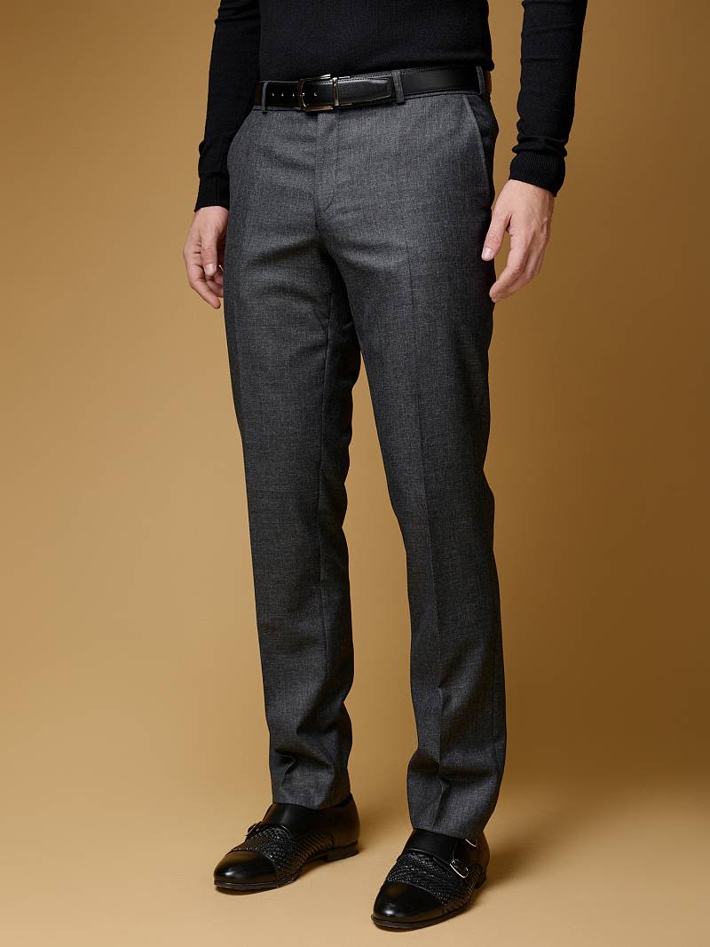 Classic fit (ПОЛУПРИЛЕГАЮЩИЙ СИЛУЭТ). Брюки без защипов, с боковыми наклонными карманами и двумя задними карманами «в рамку». Передние половинки на подкладке. Верхний срез брюк обработан поясом с корсажной лентой и шлевками под ремень. Застежка обработана на тесьму-молнию, с петлей-пуговицей на поясе и усилен металлическим крючком.
