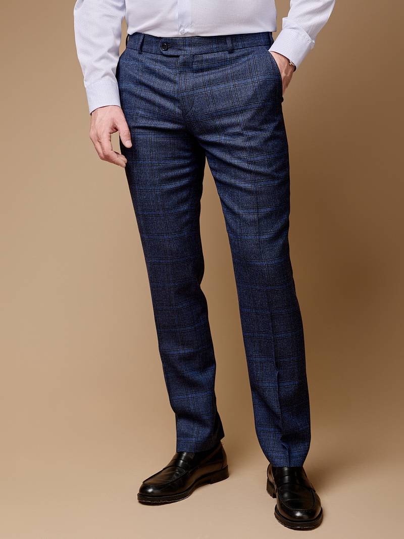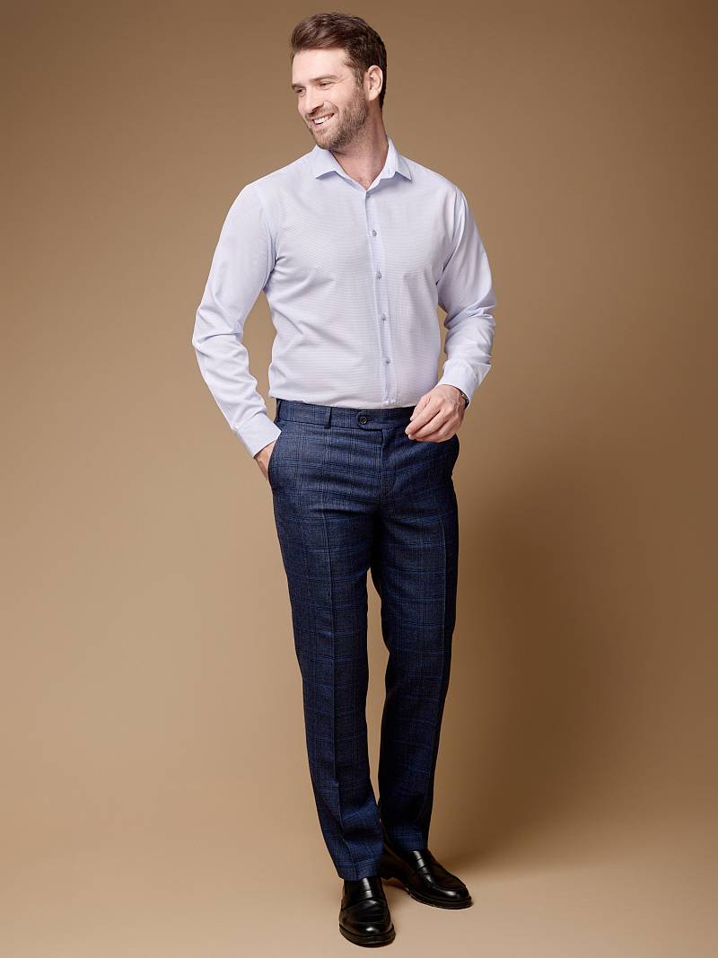 Classic fit (ПОЛУПРИЛЕГАЮЩИЙ СИЛУЭТ). Брюки без защипов, с боковыми наклонными карманами и двумя задними карманами «в рамку». Передние половинки на подкладке. Верхний срез брюк обработан поясом с корсажной лентой и шлевками под ремень. Застежка обработана на тесьму-молнию, с петлей-пуговицей на поясе и усилен металлическим крючком.