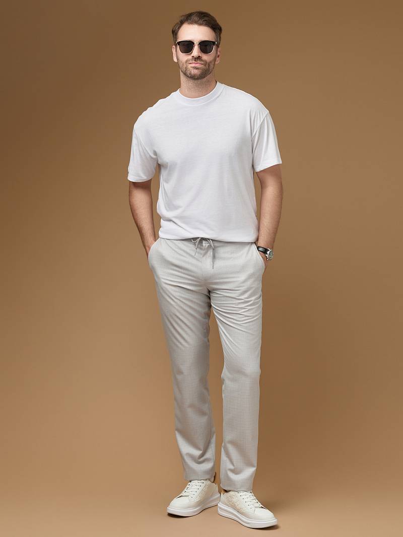 Slim fit (ПРИЛЕГАЮЩИЙ СИЛУЭТ), рекомендуется брать на размер больше. Летние брюки без защипов и стрелок гарантирует универсальность модели в любом гардеробе. Брюки с боковыми карманами и двумя задними. Верхний срез брюк обработан поясом на завязках. Брюки мужские, летние, классические, нарядные, повседневные, молодежные, casual, для работы в офисе, модные, для мужа, сына, брата, на праздник.