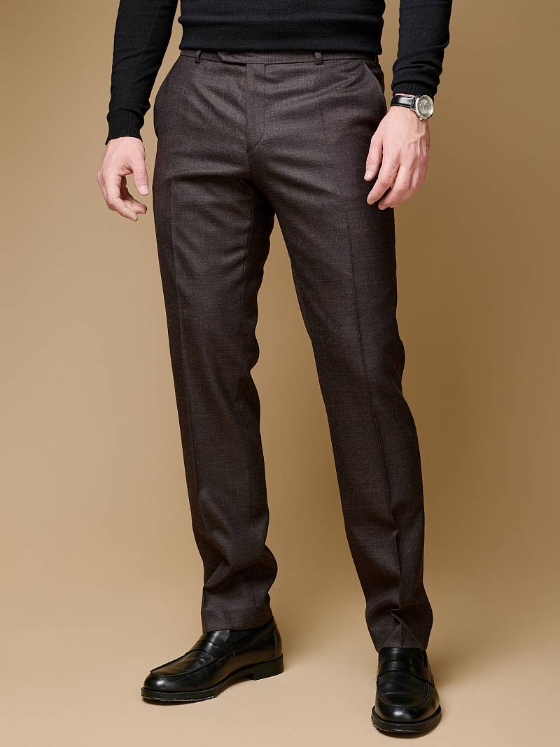 Classic fit (ПОЛУПРИЛЕГАЮЩИЙ СИЛУЭТ). Брюки без защипов, с боковыми наклонными карманами и двумя задними карманами «в рамку». Передние половинки на подкладке. Верхний срез брюк обработан поясом с корсажной лентой и шлевками под ремень. Застежка обработана на тесьму-молнию, с петлей-пуговицей на поясе и усилен металлическим крючком.