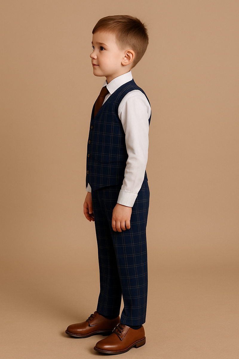 Костюм для мальчика, состоящий из жилета и брюк. Брюки без защипов, с двумя боковыми карманами и одним задним, свобода в поясе регулируется при помощи потайной резинки. Жилет с двумя боковыми карманами, по спинке расположен хлястик для регулировки объема в области талии.