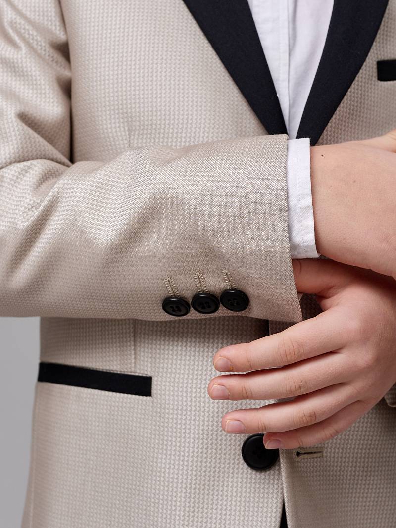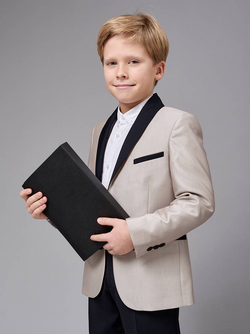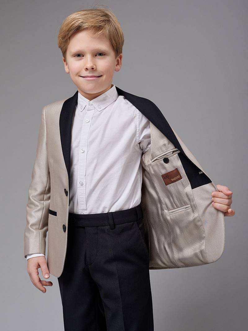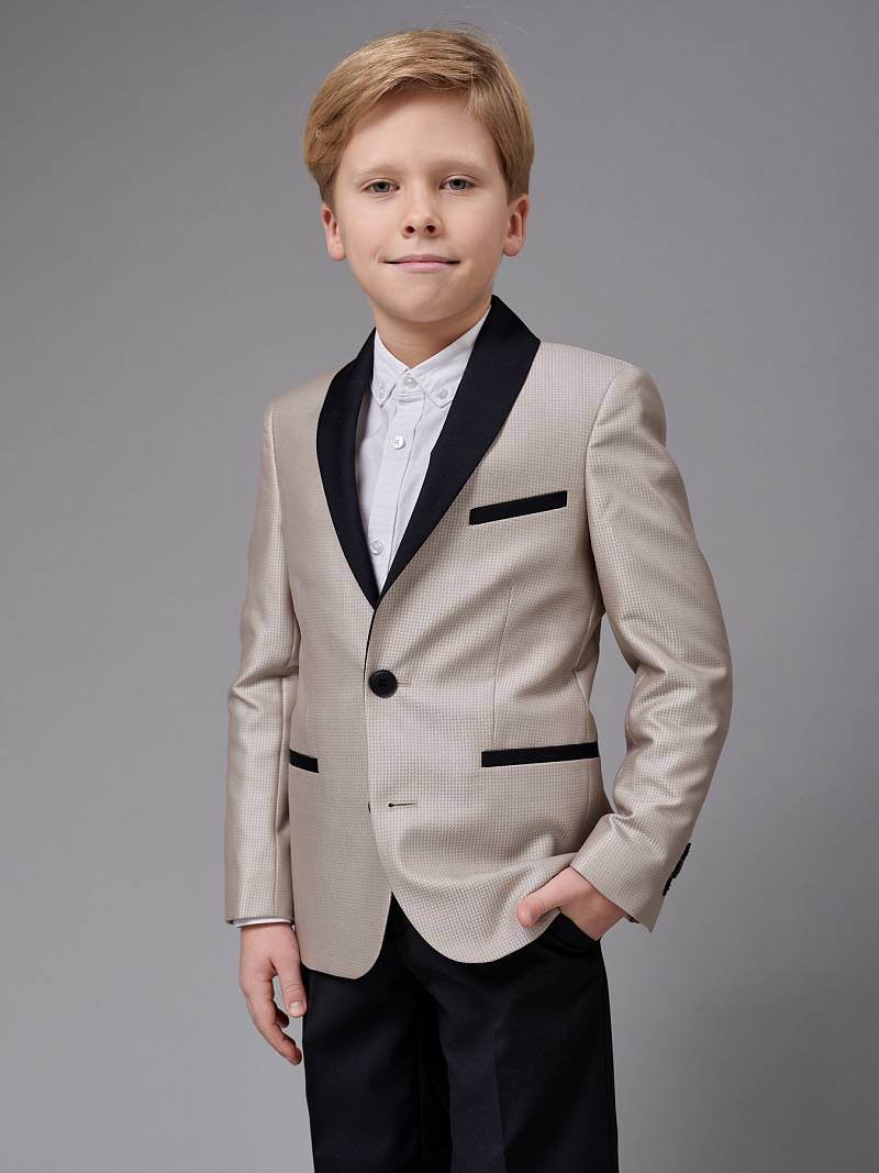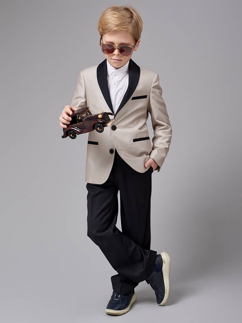 Костюм детский для мальчика (младшая группа). Пиджак с воротником-шалька, на две пуговицы, боковые и нагрудный карманы-листочки, по спинке одна шлица. Брюки без защипов с боковыми наклонными карманами и одиним задним карманом. Брюки, воротник-шалька и листочки пиджака выполнены из ткани компаньон.