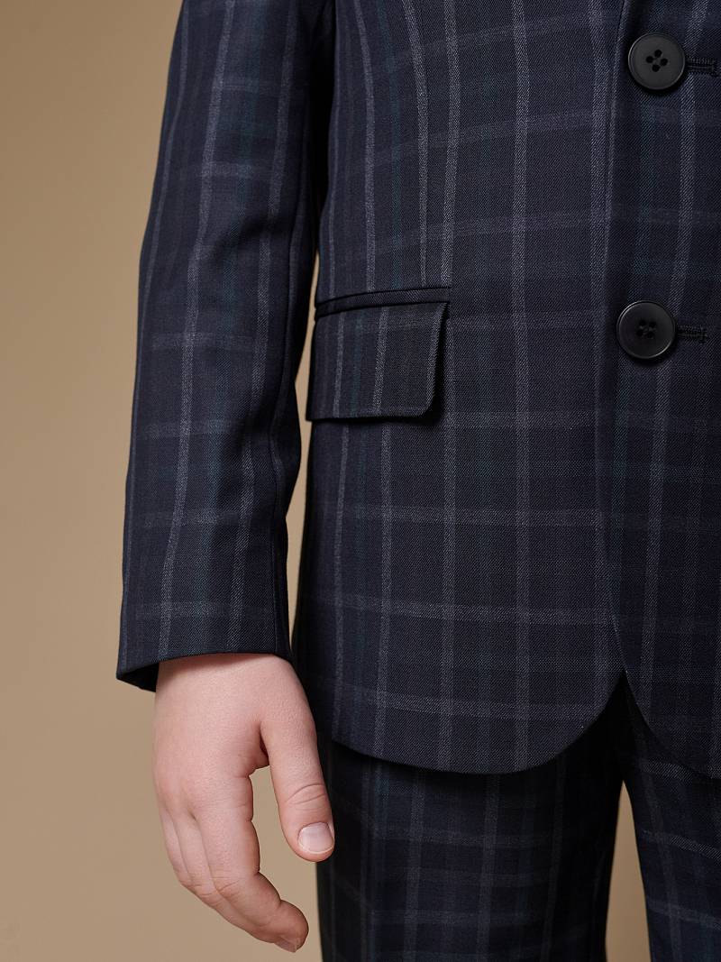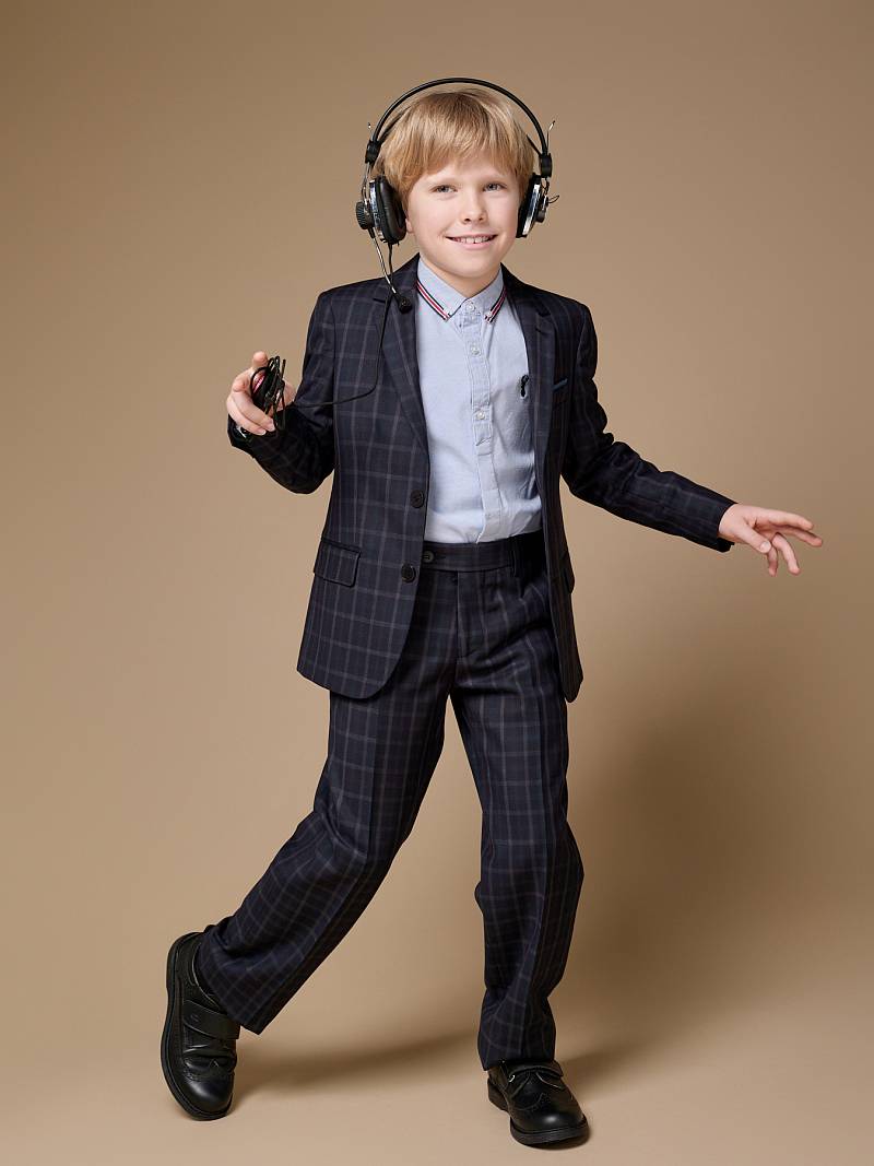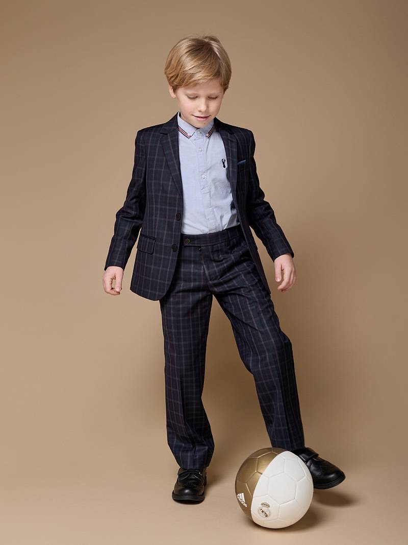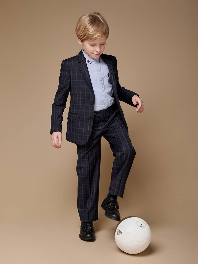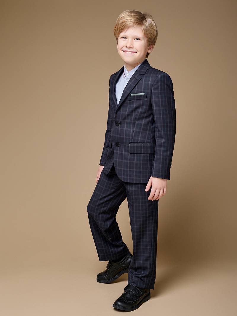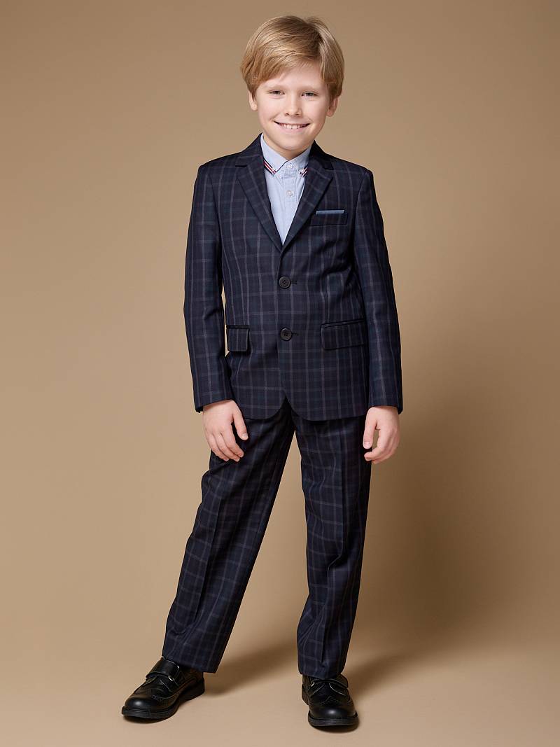 Костюм детский для мальчика (младшая группа). Пиджак на две пуговицы, с боковыми карманами с клапаном и нагрудной листочкой, по спинке одна шлица. Брюки без защипов с боковыми наклонными карманами и одиним задним карманом.