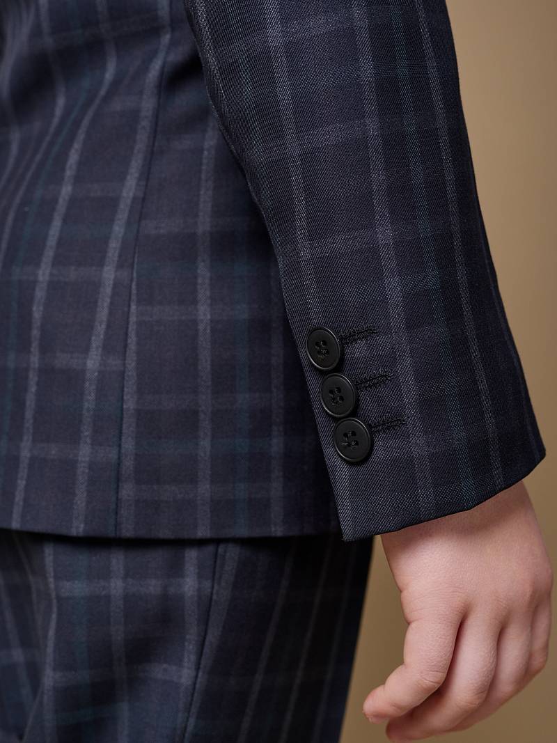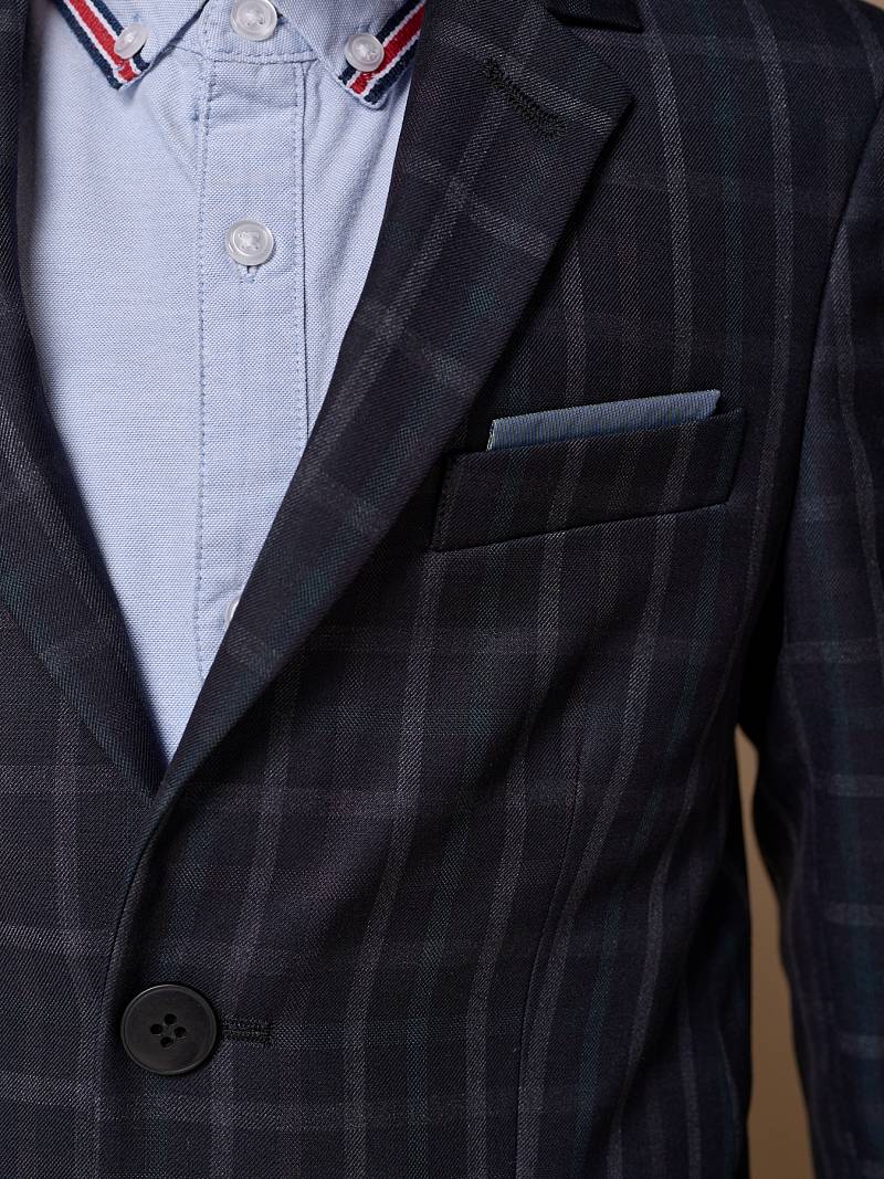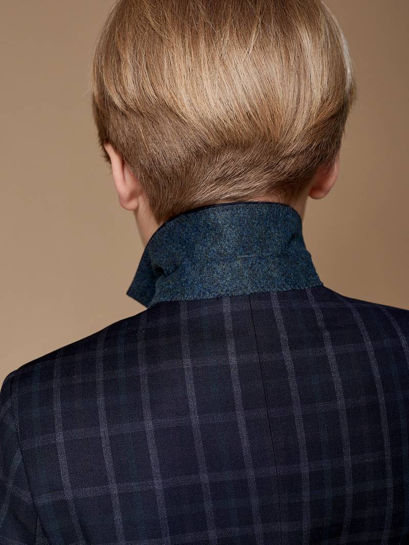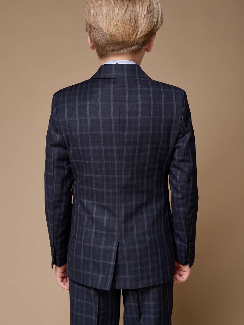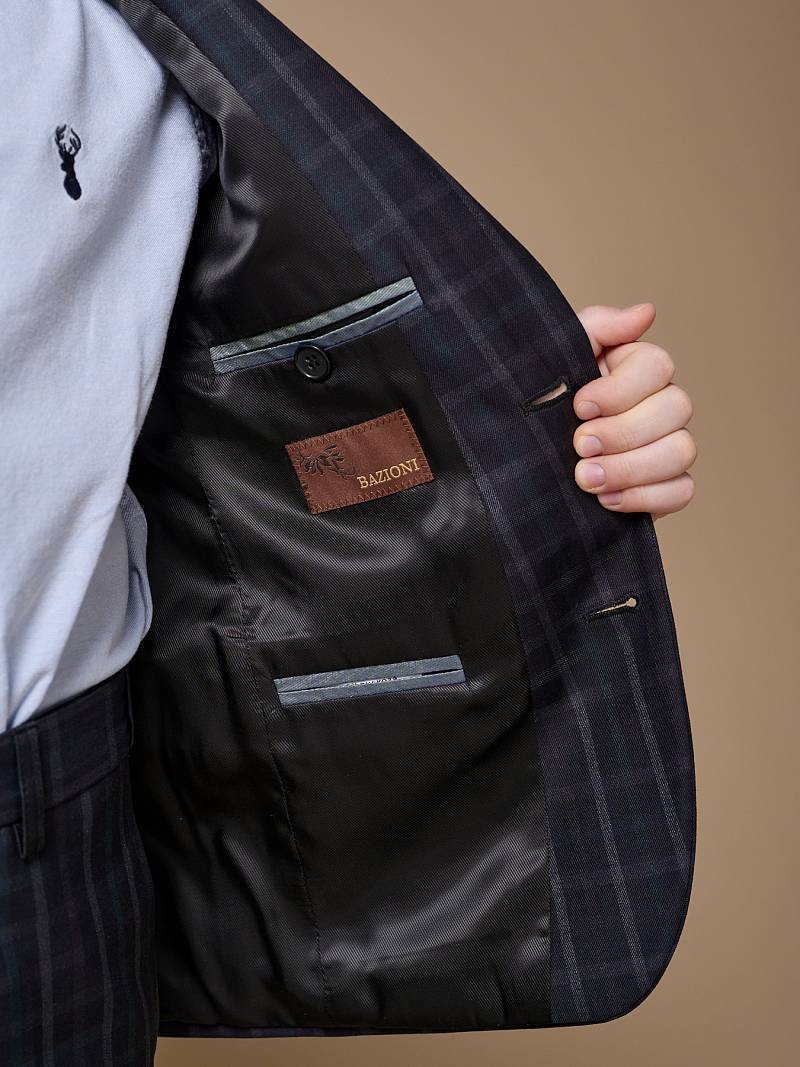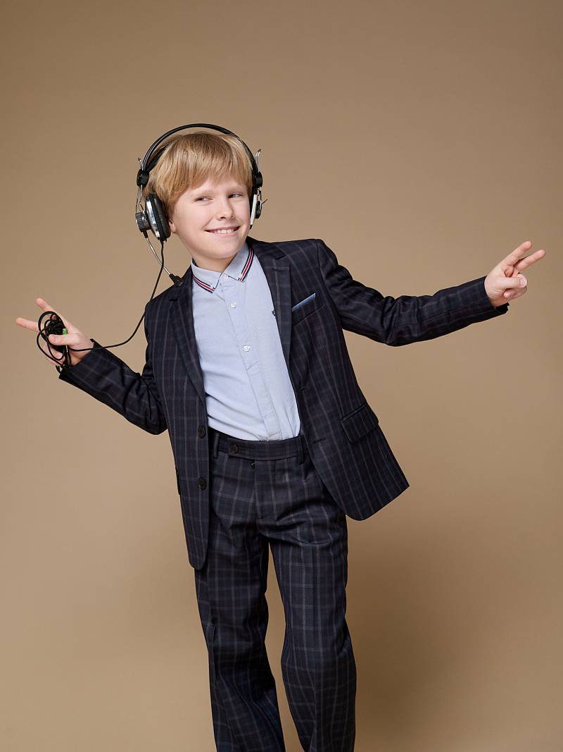 Костюм детский для мальчика (младшая группа). Пиджак на две пуговицы, с боковыми карманами с клапаном и нагрудной листочкой, по спинке одна шлица. Брюки без защипов с боковыми наклонными карманами и одиним задним карманом.