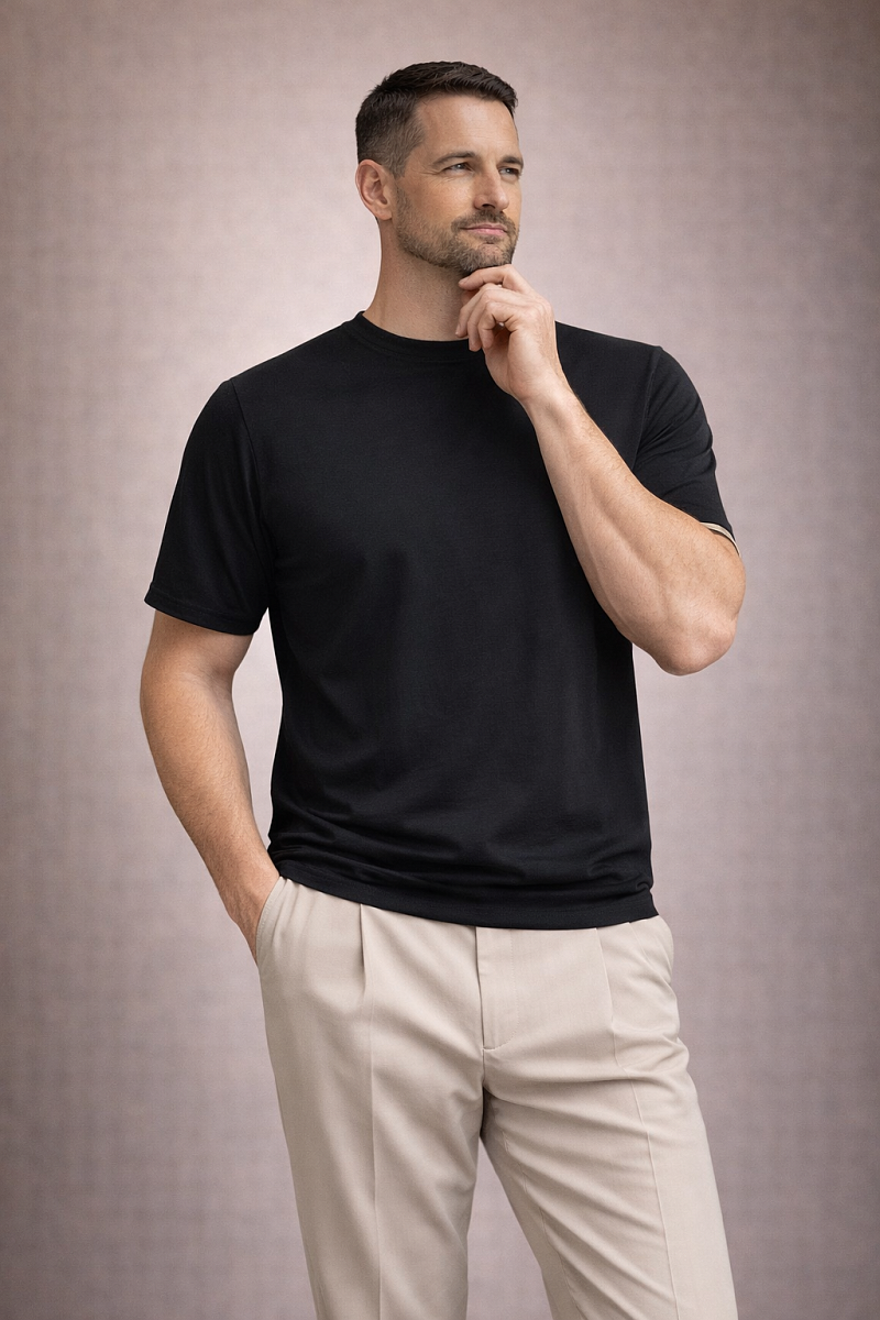 Состав: 60% хлопок,10% шелк, 25%полиэстер, 5%эластан
