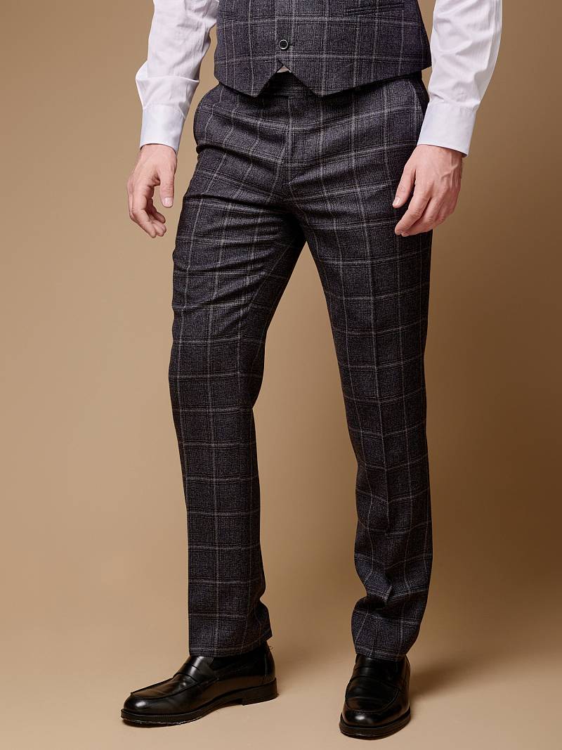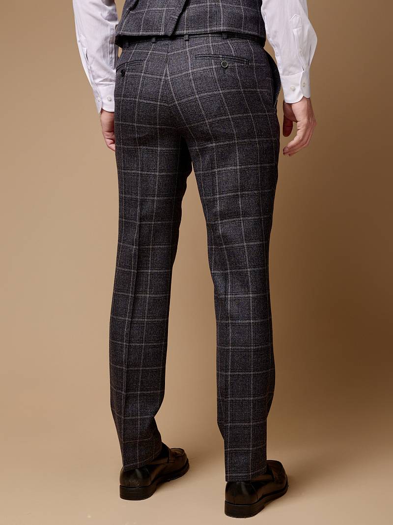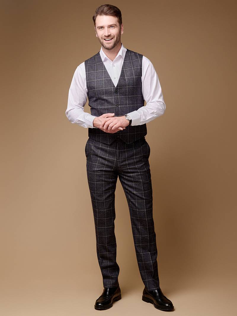 Classic fit (ПОЛУПРИЛЕГАЮЩИЙ СИЛУЭТ). Брюки без защипов, с боковыми наклонными карманами и двумя задними карманами «в рамку». Передние половинки на подкладке. Верхний срез брюк обработан поясом с корсажной лентой и шлевками под ремень. Застежка обработана на тесьму-молнию, с петлей-пуговицей на поясе и усилен металлическим крючком.