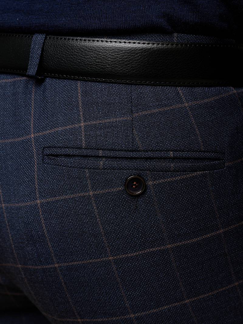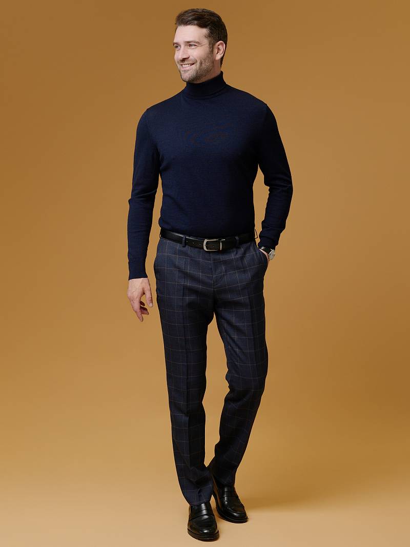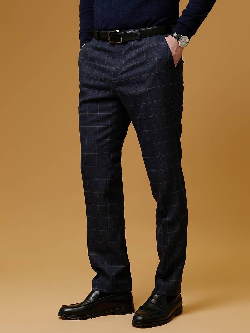 Classic fit (ПОЛУПРИЛЕГАЮЩИЙ СИЛУЭТ). Брюки без защипов, с боковыми наклонными карманами и двумя задними карманами «в рамку». Передние половинки на подкладке. Верхний срез брюк обработан поясом с корсажной лентой и шлевками под ремень. Застежка обработана на тесьму-молнию, с петлей-пуговицей на поясе и усилен металлическим крючком.
